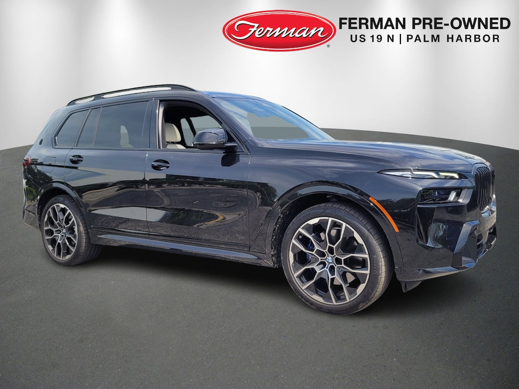 NAVIGATION*, PANORAMIC SUNROOF*, EXECUTIVE PACKAGE*, M SPORT*, M SPORT PACKAGE*, BACK UP CAMERA*, HEATED SEATS*, BLIND SPOT MONITOR*, 3RD ROW SEATING*, LANE DEPARTURE WARNING*, REMOTE ENGINE START*, M-SPORT BRAKES, 2ND ROW CAPTAIN'S CHAIRS, 22 ALLOY WHEELS, CARBON FIBER TRIM, GESTURE CONTROL, HARMAN KARDON PREMIUN SOUND SYSTEM, X7 M60i, 4D Sport Utility, 4.4L V8 DOHC 32V, 8-Speed Automatic Sport, AWD, Black Sapphire Metallic, Ivory White Leather, 16 Speakers, 2nd Row Captain's Chairs, 3rd row seats: split-bench, 4-Wheel Disc Brakes, 5-Zone Automatic Climate Control, ABS brakes, Adaptive suspension, AM/FM radio: SiriusXM, Apple CarPlay & Android Auto Compatibility, Auto High-beam Headlights, Auto-leveling suspension, Automatic temperature control, Brake assist, Carbon Fiber Trim, Climate Comfort Package, Compass, Connected Package Pro, Delay-off headlights, Dual front impact airbags, Dual front side impact airbags, Electronic Stability Control, Emergency communication system: BMW Assist eCall, Executive Package (DISC), Extended Merino Leather Upholstery, Extended Shadowline Trim, Four wheel independent suspension, Front & Rear Heated Seats, Front anti-roll bar, Front dual zone A/C, Front Massaging Seats, Front Ventilated Seats, Fully automatic headlights, Garage door transmitter, Genuine wood console insert, Genuine wood dashboard insert, Genuine wood door panel insert, Gesture Control, Glass Controls, harman/kardon Surround Sound System, harman/kardon® Speakers, Head restraints memory, Head-Up Display, Heated & Cooled Cup Holders, Illuminated entry, Knee airbag, Low tire pressure warning, M Sport Brakes w/Black Calipers, M Sport Brakes w/Blue Calipers, M Sport Package Pro, M Sport Professional Package, Memory seat, Navigation system: BMW Maps Navigation, Occupant sensing airbag, Overhead airbag, Panic alarm, Panoramic Sky Lounge LED Roof, Power adjustable front head restraints, Radio data system, Rain sensing wipers, Rear air conditioning, Rear anti-roll bar, Rear window wiper, Reclining 3rd row seat, Security system, Speed control, Speed-sensing steering, Speed-Sensitive Wipers, Spoiler, Sport steering wheel, Steering wheel memory, Steering wheel mounted audio controls, Tachometer, Telescoping steering wheel, Tilt steering wheel, Traction control, Turn signal indicator mirrors, Variably intermittent wipers, Wheels: 22 x 9.5 Fr & 22 x 10.5 Rr Double-Spoke.