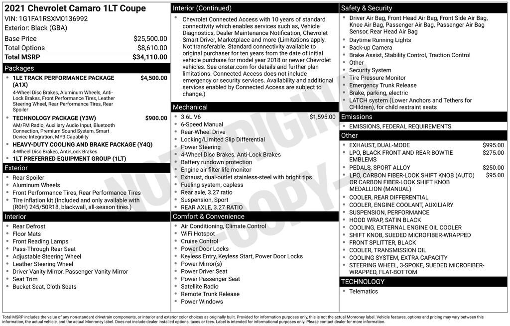Camaro 1LT, 2D Coupe, 3.6L V6 DI, 6-Speed Manual, RWD, Black, Jet Black Cloth, 6-Speaker Audio System Feature, 6-Way Power Front Passenger Seat Adjuster, 8-Way Power Driver Seat Adjuster, Alloy wheels, Black Front Splitter, Bluetooth® For Phone, Bose Premium 9-Speaker Audio System Feature, Brembo 4-Piston Front Performance Brakes, Exterior Parking Camera Rear, External Engine Oil Cooler, Extra Capacity Cooling System, Front Bucket Seats, Front Sport Bucket Seats, Heavy-Duty Cooling & Brake Package, Performance Suspension, Preferred Equipment Group 1LT, Radio: Chevrolet Infotainment 3 Plus System, Rear Differential Cooler, Satin Black Hood Wrap, Satin Black Rear Blade Spoiler, SiriusXM w/360L, Sueded Flat-Bottom 3-Spoke Steering Wheel, Sueded Microfiber-Wrapped Shift Knob, Technology Package, Transmission Oil Cooler, V6 1LE Track Performance Package, Wheels: 20 x 8.5 Fr & 20 x 9.5 Rr Forged Alum.