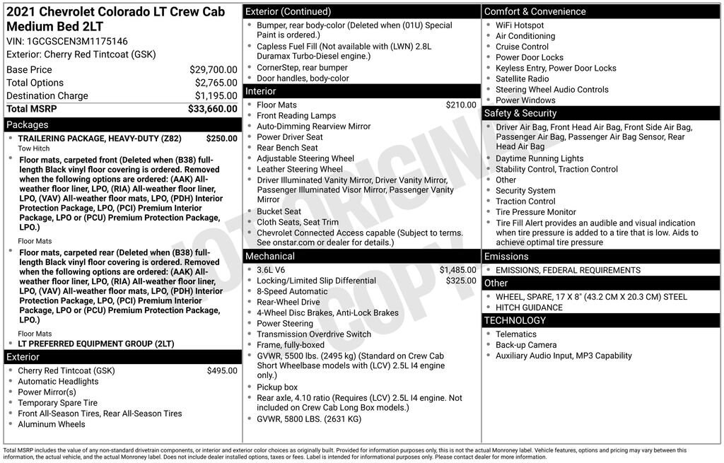 Colorado LT, 4D Crew Cab, V6, 8-Speed Automatic, RWD, Cherry Red Tintcoat, Black Cloth, 1st & 2nd Row All-Weather Floor Liner (LPO), Air Conditioning, Apple CarPlay/Android Auto, Enhanced Driver Instrument Information Display, Front Bucket Seats, Heavy-Duty Trailering Package, Hitch Guidance, Power driver seat, Power steering, Power windows, Preferred Equipment Group 2LT, Premium audio system: Chevrolet Infotainment 3, Rear Vision Camera.