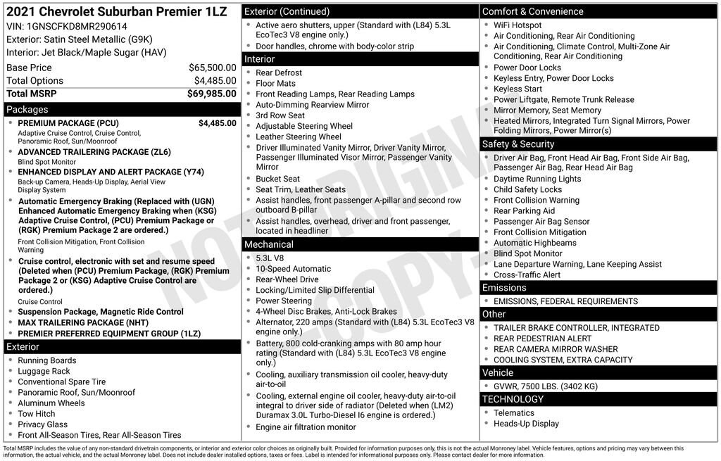 Suburban Premier, 4D Sport Utility, EcoTec3 5.3L V8, 10-Speed Automatic with Overdrive, RWD, Satin Steel Metallic, Jet Black/Maple Sugar Leather, 12-Way Power Driver & Passenger Seat Adjusters, 15 Diagonal Multi-Color Head-Up Display, 1st & 2nd Row Color-Keyed Carpeted Floor Mats, 2 USB Data Ports, 3rd Row 60/40 Power-Folding Split-Bench, Adaptive Cruise Control, Advanced Trailering Package, Advanced Trailering System, Auto-Dimming Inside Rear-View Mirror, Automatic Heated Steering Wheel, Bose 10-Speaker Surround w/CenterPoint, Bright Front & Rear Door Sill Plates, Chrome Door Handles w/Body-Color Strip, Chrome Mirror Caps, Color-Keyed Carpeting Floor Covering, Driver & Front Outboard Passenger Airbags, Dual Exhaust System, Dual-Pane Power Panoramic Sunroof, Enhanced Automatic Emergency Braking, Enhanced Display & Alert Package, Enhanced Driver Information Center, Extra Capacity Cooling System, Floor Console w/Storage Area, Front & Rear Park Assist, Hands-Free Rear Power Programmable Liftgate, HD Radio, HD Surround Vision, Heated & Ventilated Driver & Front Passenger Seats, Heated 2nd Row Outboard Seats, Heated Driver & Front Passenger Seats, Hitch Guidance w/Hitch View, Infotainment Display, Inside Rearview Auto-Dimming Rear Camera Mirror, Integrated Trailer Brake Controller, Lane Change Alert w/Side Blind Zone Alert, Lane Keep Assist w/Lane Departure Warning, Leather-Wrapped Steering Wheel, LED Daytime Running Lamps, Max Trailering Package, Memory Settings, Navigation System, Outside Heated Power-Adjustable Mirrors, Power Release 2nd Row Bucket Seats, Power Tilt & Telescopic Steering Column, Preferred Equipment Group 1LZ, Premium Package, Rear Camera Mirror Washer, Rear Cross Traffic Alert, Rear Pedestrian Alert, Remote Start, Safety Alert Seat, SiriusXM Radio w/360L, Trailer Side Blind Zone Alert, Universal Home Remote.
