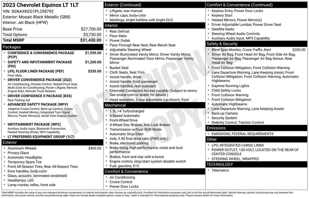 Equinox LT, 4D Sport Utility, 1.5L DOHC, 6-Speed Automatic Electronic with Overdrive, FWD, Mosaic Black Metallic, Jet Black Cloth, 2 Rear USB Charging-Only Ports, 2 USB Data Ports, 2 USB Data Ports w/SD Card Reader, Adaptive Cruise Control, Advanced Safety Package, Bluetooth® For Phone, Confidence & Convenience Package, Driver Confidence II Package, Driver Convenience Package, Dual-Zone Automatic Climate Control, Front & Rear Park Assist, HD Surround Vision, Heated Driver & Front Passenger Seats, Heated Steering Wheel, Infotainment Package, Lane Change Alert w/Side Blind Zone Alert, Outside Heated Power-Adjustable Mirrors, Power driver seat, Preferred Equipment Group 1LT, Radio: Chevrolet Infotainment 3 Plus System, Rear Cross Traffic Alert, Rear Power Liftgate, Remote Start, Safety & Infotainment Package, Side Blind Zone & Rear Cross Traffic, SiriusXM Radio, Wrapped Steering Wheel.