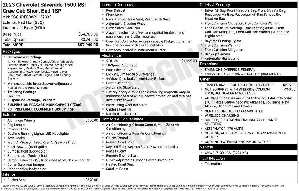 Silverado 1500 RST, 4D Crew Cab, EcoTec3 5.3L V8, 10-Speed Automatic, 4WD, Red Hot, Black Cloth, 10-Way Power Driver Seat w/Lumbar, 12.3 Multicolor Reconfigurable Digital Display, 120-Volt Bed Mounted Power Outlet, 120-Volt Instrument Panel Power Outlet, 6-Speaker Audio System, All-Star Edition, Apple CarPlay/Android Auto, Auto-Locking Rear Differential, Bluetooth® For Phone, Chevrolet Connected Access Capable, Color-Keyed Carpeting Floor Covering, Compass, Convenience Package, Deep-Tinted Glass, Dual Rear USB Ports (Charge Only), Dual-Zone Automatic Climate Control, Electric Rear-Window Defogger, Electrical Steering Column Lock, Electronic Cruise Control, EZ Lift Power Lock & Release Tailgate, Front Frame-Mounted Black Recovery Hooks, Front LED Fog Lamps, Front Rubberized Vinyl Floor Mats, HD Rear Vision Camera, Heated Driver & Front Outboard Passenger Seats, Heated Power-Adjustable Outside Mirrors, Heated Steering Wheel, High Capacity Suspension Package, High Gloss Black Mirror Caps, Hitch Guidance, Inside Rear-View Mirror w/Tilt, Keyless Open & Start, LED Cargo Area Lighting, OnStar & Chevrolet Connected Services Capable, Power Front Windows w/Driver Express Up/Down, Power Front Windows w/Passenger Express Down, Power Rear Windows w/Express Down, Preferred Equipment Group 1SP, Rear 60/40 Folding Bench Seat (Folds Up), Rear Rubberized-Vinyl Floor Mats, Remote Vehicle Starter System, SiriusXM w/360L, Standard Suspension Package, Standard Tailgate, Steering Wheel Audio Controls, Theft Deterrent System (Unauthorized Entry), Trailering Package, Wi-Fi Hot Spot Capable, Wireless Phone Projection, Wrapped Steering Wheel.