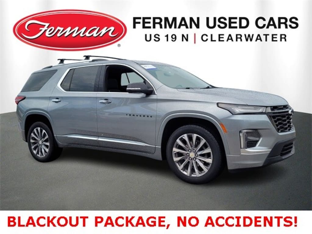 UNDER FACTORY WARRANTY, FIND IT AT FERMAN!, Free Delivery within 100 miles!, The 2023 Chevrolet Traverse Premier with Blackout Package offers a bold blend of sophistication, performance, and stealthy styling. Powered by a 3.6L V6 engine producing 310 horsepower and 266 lb-ft of torque, it delivers confident acceleration and smooth highway cruising. A 9-speed automatic transmission and available all-wheel drive provide enhanced control and versatility in a variety of road conditions. The Blackout Package gives the Traverse a dramatic, head-turning look with gloss-black accents replacing traditional chrome elements. It includes a blacked-out grille, Chevrolet bowtie emblems, exterior badging, and mirror caps. Combined with 20-inch gloss-black wheels and sleek LED lighting, the package adds a sporty, aggressive edge to the SUV's exterior. Inside, the Premier trim features a spacious and upscale cabin with perforated leather seating, heated front seats, a heated steering wheel, and dual-zone automatic climate control. Driver memory settings, a hands-free programmable liftgate, and ambient lighting enhance convenience and comfort. The second row offers either a bench or available captains chairs, and the third row folds flat for added cargo flexibility. Technology includes an 8-inch touchscreen with built-in navigation, wireless Apple CarPlay and Android Auto, a Bose premium sound system, Wi-Fi hotspot capability, multiple USB ports, and a digital driver information center. Advanced safety features come standard, including lane keep assist, automatic emergency braking, blind-spot monitoring, rear cross-traffic alert, and a surround-view camera system. With seating for up to eight, nearly 98 cubic feet of max cargo space, and a towing capacity of up to 5,000 pounds when properly equipped, the 2023 Traverse Premier is ready for family adventures. The Blackout Package enhances its premium appeal with a sleek, modern aestheticperfect for drivers who want both luxury and bold design in a three-row SUV. Ask ChatGPT., BLACKOUT PKG, HEATED AND VENTILATED SEATS, APPLE CARPLAY, ANDROID AUTO, BOSE SOUND, REAR CAMERA, PWR LIFTGATE, 3RD ROW FAMILY FUN, 3rd row seats: split-bench, 4-Wheel Disc Brakes, 6-Way Power Front Passenger Seat, 8-Way Power Driver Seat Adjuster, Air Conditioning, Apple CarPlay/Android Auto, Automatic temperature control, Black Bowtie, Black Grille (LPO), Black Mirror Caps (LPO), Black Nameplate Kit (LPO), Black Rear License Plate Applique (LPO), Blackout Package (LPO), Bose Premium 10-Speaker Audio System Feature, Brake assist, Dual front impact airbags, Dual front side impact airbags, Dual SkyScape 2-Panel Power Sunroof, Electronic Stability Control, Emergency communication system, Exterior Parking Camera Rear, Four wheel independent suspension, Front anti-roll bar, Front Bucket Seats, Front Center Armrest, Front dual zone A/C, Front reading lights, Fully automatic headlights, Garage door transmitter, Heated 2nd Row Outboard Position Seats, Heated door mirrors, Heated Driver & Front Passenger Seats, Heated steering wheel, Illuminated entry, Low tire pressure warning, Memory seat, Navigation System, Occupant sensing airbag, Overhead airbag, Panic alarm, Perforated Leather-Appointed Seat Trim, Power door mirrors, Power Driver Lumbar Control, Power driver seat, Power Liftgate, Power passenger seat, Power steering, Power windows, Preferred Equipment Group 1LZ, Rear air conditioning, Rear anti-roll bar, Remote keyless entry, Security system, SiriusXM w/360L
