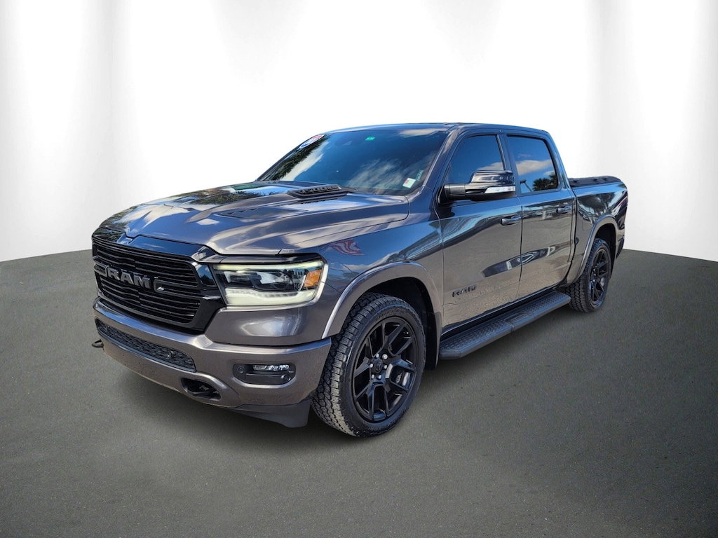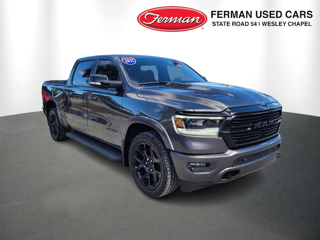 2021 Ram 1500 Laramie Laramie Clean Carfax Certified, FCA US LLC Certified Pre-Owned Certified, Accent Color Premium Power Mirrors, Anti-Spin Differential Rear Axle, Auto Dimming Exterior Passenger Mirror, Auto High Beam Headlamp Control, Black Exterior Truck Badging, Black Headlamp Bezels, Black Interior Accents, Black Painted Exterior Mirrors Caps, Blind Spot & Cross Path Detection, Body Color Door Handles, Body Color Front Bumper, Body Color Rear Bumper w/Step Pads, Dual Exhaust w/Black Tips, Foam Bottle Insert (Door Trim Panel), GPS Navigation, Grille Surround 3 Black Texture 2 Black, harman/kardon 19 Speaker Premium Sound, Heated Second Row Seats, Laramie Level 2 Equipment Group (DISC), Leather Trimmed Bucket Seats, Mopar Black Tubular Side Steps, Night Edition, ParkSense Front/Rear Park Assist w/Stop, Quick Order Package 27H Laramie, Radio: Uconnect 4C Nav w/8.4 Display, Rain Sensitive Windshield Wipers, Rear 60/40 Folding Split Recline Seat, Rear Underseat Compartment Storage, Remote Tailgate Release, Sport Performance Hood, Tailgate Ajar Warning Lamp, Wheels: 22 x 9 Forged Aluminum, #1 Seat Foam Cushion, 1-Yr SiriusXM Guardian Trial, 10 Speakers, 12 Touchscreen Display, 3 Rear Seat Head Restraints, 4 Way Front Headrests, 4-Wheel Disc Brakes, 48V Belt Starter Generator, 4G LTE Wi-Fi Hot Spot, 5-Year SiriusXM Traffic Service, 5-Year SiriusXM Travel Link Service, 8.4 Touchscreen Display, ABS brakes, Adjustable pedals, Air Conditioning, Alloy wheels, AM/FM radio: SiriusXM, Apple CarPlay, Apple CarPlay/Android Auto, Audio memory, Auto-dimming door mirrors, Auto-dimming Rear-View mirror, Automatic temperature control, Brake assist, Bumpers: chrome, Chrome Exterior Mirrors, Compass, Delay-off headlights, Disassociated Touchscreen Display, Dome Dual LED Reading Lamp, Driver door bin, Driver Seat Memory, Driver vanity mirror, Dual front impact airbags, Dual front side impact airbags, Dual-Pane Panoramic Sunroof, Electronic Stability Control, For Details, Visit DriveUconnect.com, For More Info, Call 800-643-2112, Front anti-roll bar, Front Center Armrest w/Storage, Front dual zone A/C, Front fog lights, Front reading lights, Front Seat Back Map Pockets, Front wheel independent suspension, Fully automatic headlights, Garage door transmitter, Google Android Auto, GPS Antenna Input, HD Radio, Heated door mirrors, Heated Front Seats, Heated front seats, Heated Steering Wheel, Heated steering wheel, Illuminated entry, Integrated Center Stack Radio, Integrated Voice Command w/Bluetooth, Leather steering wheel, Leather Trim 40/20/40 Bench Seat, LED Dome/Reading Lamp, Low tire pressure warning, Memory seat, MOPAR Front & Rear Rubber Floor Mats, Occupant sensing airbag, Outside temperature display, Overhead airbag, Overhead console, Panic alarm, ParkView Rear Back-Up Camera, Passenger door bin, Passenger vanity mirror, Pedal memory, Power 4-Way Driver Lumbar Adjust, Power 4-Way Passenger Lumbar Adjust, Power 8-Way Driver & Passenger Seats, Power door mirrors, Power driver seat, Power passenger seat, Power steering, Power windows, Radio data system, Radio: Uconnect 12 w/Navigation, Radio: Uconnect 4 w/8.4 Display, Rear anti-roll bar, Rear seat center armrest, Rear step bumper, Rear window defroster, Remote keyless entry, Secu