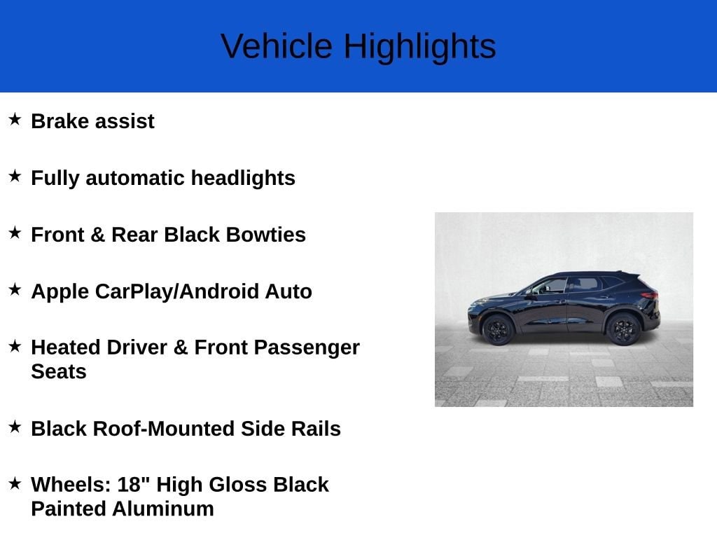 Delivers 27 Highway MPG and 22 City MPG! This Chevrolet Blazer delivers a Turbocharged Gas I4 2.0L/ engine powering this Automatic transmission. WHEELS, 18" (45.7 CM) HIGH GLOSS BLACK PAINTED ALUMINUM, TRANSMISSION, 9-SPEED AUTOMATIC, ELECTRONICALLY-CONTROLLED with overdrive, includes Driver Shift Control (STD), TIRES, P235/65R18 ALL-SEASON BLACKWALL (STD).
