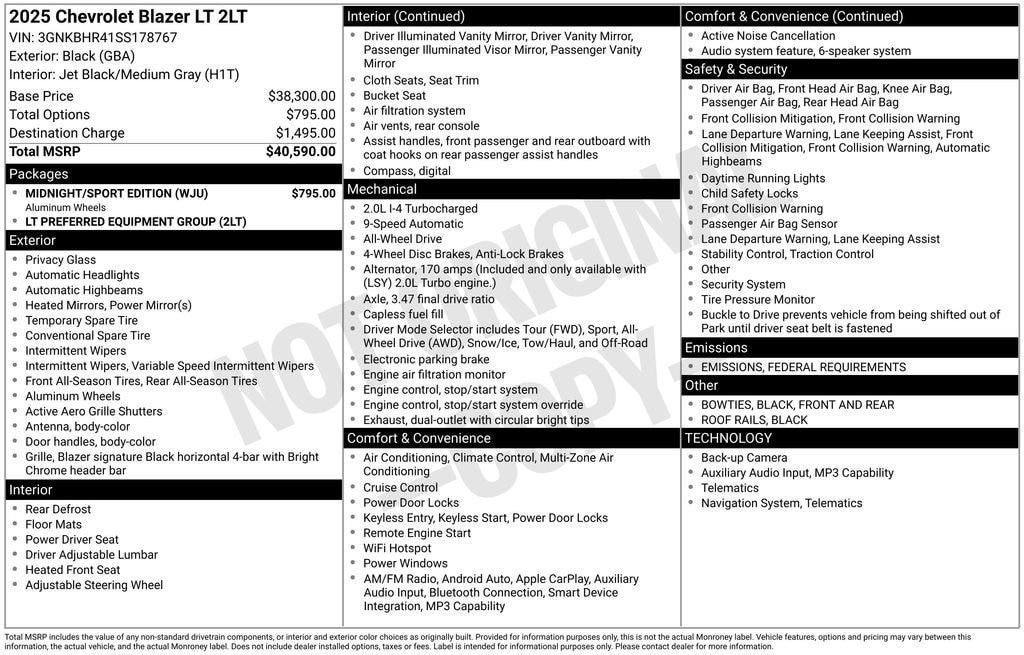 SEATS, FRONT BUCKET (STD), ROOF RAILS, BLACK roof-mounted side rails, MIDNIGHT/SPORT EDITION includes Gloss Black grille bar, (B94) front and rear Black bowties, Black mirrors, Gloss Black nameplate (and AWD badge on AWD models), (WQN) 18" High Gloss Black painted aluminum wheels, and Black center caps with Black logo (Also includes (V59) Black roof-mounted side rails., LT PREFERRED EQUIPMENT GROUP includes Standard Equipment, JET BLACK/MEDIUM GRAY, PREMIUM CLOTH SEAT TRIM, ENGINE, 2.0L TURBO, 4-CYLINDER, SIDI DOHC WITH VARIABLE VALVE TIMING (VVT) with Stop/Start (228 hp (170 kW) at 5000 rpm, 258 lb-ft of torque [350 N-m]) @ 1500-4000 rpm) (STD), BOWTIES, BLACK, FRONT AND REAR, BLACK, AXLE, 3.47 FINAL DRIVE RATIO, AUDIO SYSTEM, CHEVROLET INFOTAINMENT 3 PLUS SYSTEM 10.2" diagonal HD color touchscreen, AM/FM stereo, Bluetooth audio streaming for 2 active devices, Apple CarPlay and Android Auto capable, enhanced voice recognition, in-vehicle apps, cloud connected personalization for select infotainment and vehicle settings. Subscription required for enhanced and connected services after trial period. (STD).