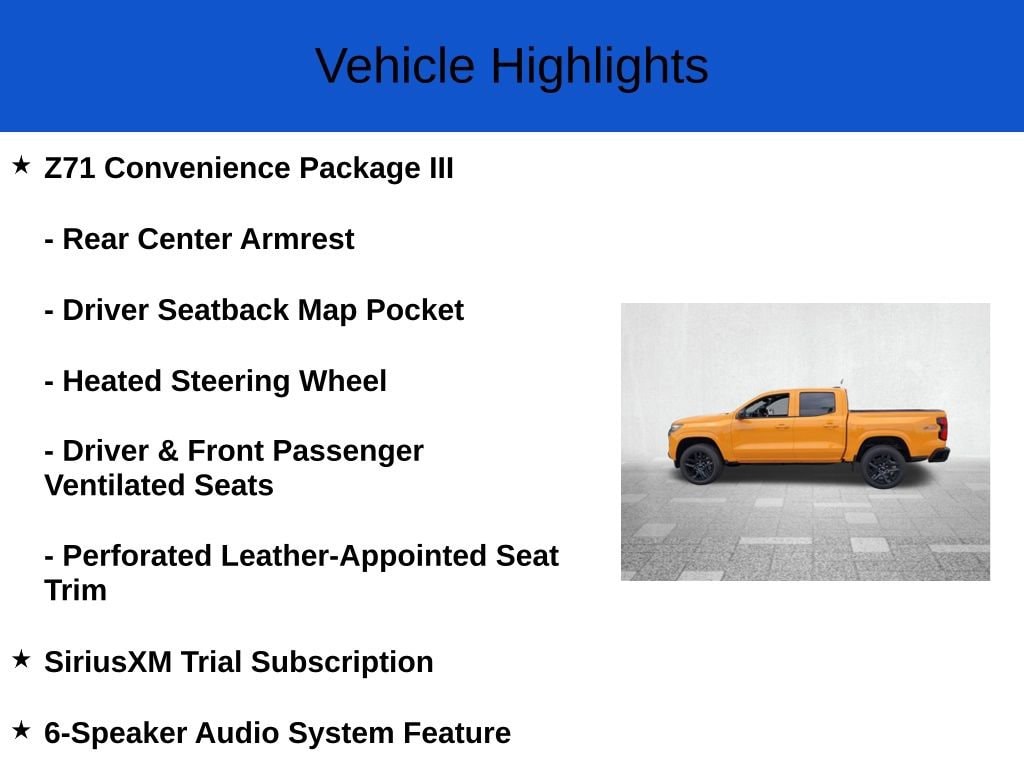 Scores 22 Highway MPG and 18 City MPG! This Chevrolet Colorado boasts a Turbocharged Gas I4 2.7L/ engine powering this Automatic transmission. Z71 PREFERRED EQUIPMENT GROUP includes standard equipment, Z71 CONVENIENCE PACKAGE III includes (A45) Driver Memory Settings, (DA5) Rear center arm rest, (E90) Driver seat back pocket, (KI3) Heated steering wheel and (KU9) Ventilated front seats (Also includes (HUQ) Perforated leather-appointed front seats.), WHEELS, 20" X 9" (50.8 CM X 22.9 CM), HIGH GLOSS BLACK ALUMINUM.