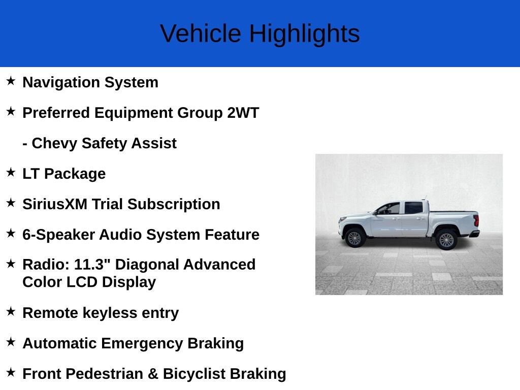 Boasts 24 Highway MPG and 19 City MPG! This Chevrolet Colorado delivers a Turbocharged Gas I4 2.7L/ engine powering this Automatic transmission. WHEELS, 17" X 8" (43.2 CM X 20.3 CM), ARGENT METALLIC ALUMINUM (STD), TRANSMISSION, 8-SPEED AUTOMATIC (STD), SUMMIT WHITE.