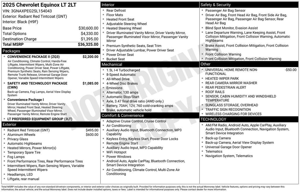 SAFETY AND TECHNOLOGY PACKAGE includes (DRZ) Rear Camera Mirror, (T3U) front fog lamps, (UKK) Rear Pedestrian Alert, (UV2) HD Surround Vision and (UVX) Traffic Sign Recognition., CONVENIENCE PACKAGE II Includes (A2X) 8-way power driver seat adjuster, (AL9) 2-way power driver seat adjuster, (ASV) cabin humidity and windshield sensor, (CE1) Rainsense intermittent front wipers, (CJ2) dual-zone automatic climate control, (CMO) Heated Wiper Park, (K4C) Wireless Charging, (TCP) AutoSense, hands-free power programmable liftgate, (UG1) Universal Home Remote, (VK8) sunglass holder and (V2P) roof rails (Also includes Evotex seating in (H9F) Black or (ENY) Artemis Gray. , UNIVERSAL HOME REMOTE NON-FUNCTIONAL see dealer for details., UNIVERSAL HOME REMOTE includes garage door opener, programmable, TRANSMISSION, 8-SPEED AUTOMATIC (STD), TRAFFIC SIGN RECOGNITION, TIRES, 235/55R19, ALL-SEASON BLACKWALL, SUNGLASS STORAGE, OVERHEAD, SENSOR, CABIN HUMIDITY AND WINDSHIELD TEMPERATURE, SEATS, FRONT BUCKET (STD).