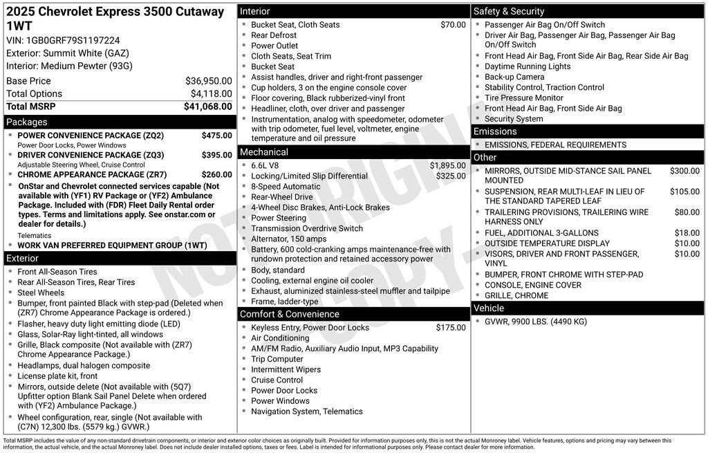 POWER CONVENIENCE PACKAGE includes (A31) power windows and (AU3) power door locks, DRIVER CONVENIENCE PACKAGE includes Tilt-Wheel and (K34) cruise control, CHROME APPEARANCE PACKAGE (Includes (V46) front chrome bumper and (V22) chrome grille. , WHEEL CONFIGURATION, REAR, SINGLE (STD), VISORS, DRIVER AND FRONT PASSENGER, VINYL in lieu of standard cloth, TRANSMISSION, 8-SPEED AUTOMATIC, HEAVY-DUTY electronically controlled with overdrive and tow/haul mode. Includes Cruise Grade Braking, Powertrain Grade Braking, and Tap-Up/Tap-Down Driver Shift Control, TRAILERING PROVISIONS, TRAILERING WIRE HARNESS ONLY, TIRES, REAR LT245/75R16E ALL-SEASON, BLACKWALL (STD) Jack and spare tire equipment bracket are not included.), TIRES, FRONT LT245/75R16E ALL-SEASON, BLACKWALL (STD) Jack and spare tire equipment bracket are not included.), THEFT ALARM NOTIFICATION requires paid plan, working electrical system, cell reception, GPS signal, armed GM factory-installed theft-deterrent system, contact method on file and enrollment to receive alerts. Message and data rates may apply. See onstar.com for details and limitations.