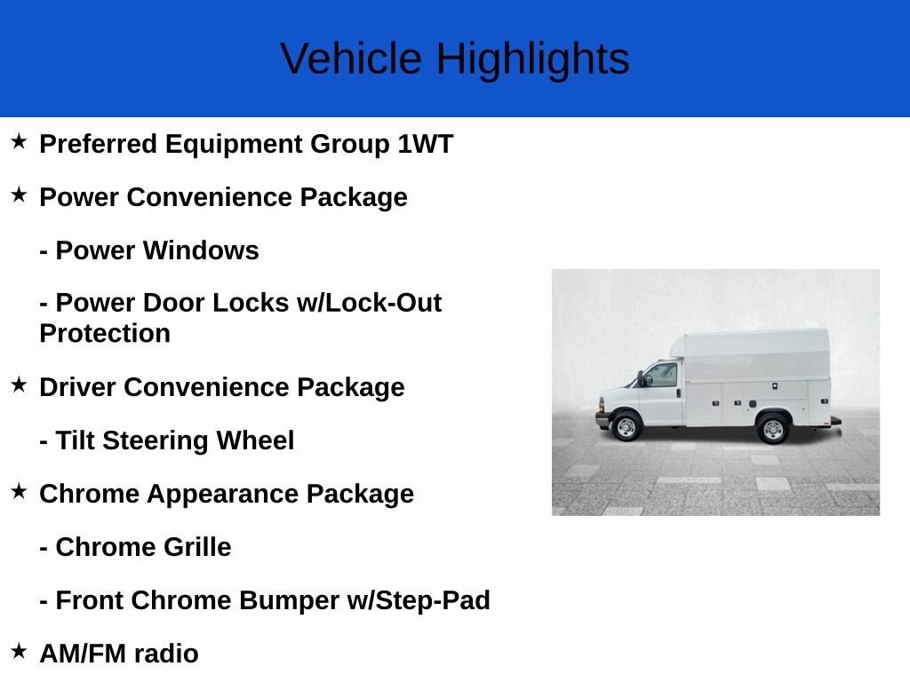 POWER CONVENIENCE PACKAGE includes (A31) power windows and (AU3) power door locks, DRIVER CONVENIENCE PACKAGE includes Tilt-Wheel and (K34) cruise control, CHROME APPEARANCE PACKAGE (Includes (V46) front chrome bumper and (V22) chrome grille. , WHEEL CONFIGURATION, REAR, SINGLE (STD), VISORS, DRIVER AND FRONT PASSENGER, VINYL in lieu of standard cloth, TRANSMISSION, 8-SPEED AUTOMATIC, HEAVY-DUTY electronically controlled with overdrive and tow/haul mode. Includes Cruise Grade Braking, Powertrain Grade Braking, and Tap-Up/Tap-Down Driver Shift Control, TRAILERING PROVISIONS, TRAILERING WIRE HARNESS ONLY, TIRES, REAR LT245/75R16E ALL-SEASON, BLACKWALL (STD) Jack and spare tire equipment bracket are not included.), TIRES, FRONT LT245/75R16E ALL-SEASON, BLACKWALL (STD) Jack and spare tire equipment bracket are not included.), THEFT ALARM NOTIFICATION requires paid plan, working electrical system, cell reception, GPS signal, armed GM factory-installed theft-deterrent system, contact method on file and enrollment to receive alerts. Message and data rates may apply. See onstar.com for details and limitations.