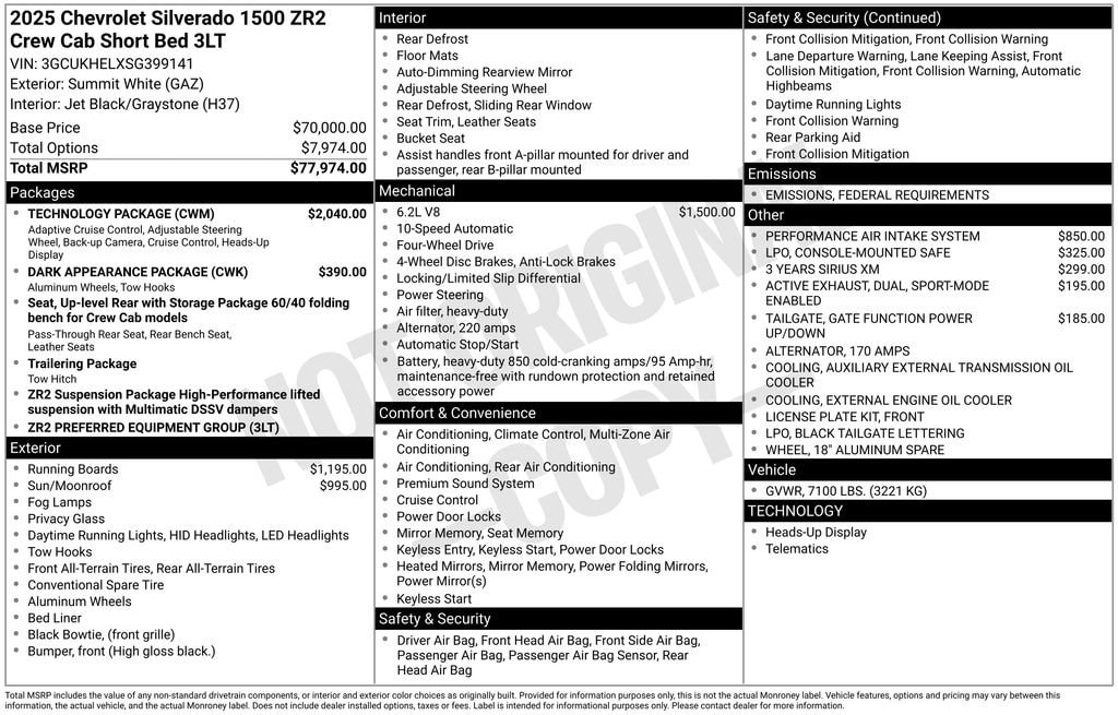 TECHNOLOGY PACKAGE includes (DRZ) Rear Camera Mirror and (UV6) 15" Diagonal Head-Up Display (Includes (KSG) Adaptive Cruise Control and (N38) Power Tilt/Telescoping steering column.), DARK APPEARANCE PACKAGE includes Black badging/decals and exhaust tips. Includes (V76) Black Tow Hooks, and (RQL) 18" Gloss Black Wheels. Exhaust ends high under rear bumper with no exposed exhaust tips.) , TRANSMISSION, 10-SPEED AUTOMATIC with Electronic Transmission Range Selector, (ETRS), electronically controlled with overdrive, tow/haul mode and steering column paddle shifters. Includes Cruise Grade Braking and Powertrain Grade Braking, TAILGATE, GATE FUNCTION POWER UP/DOWN with power lock and release, SUNROOF, POWER on Crew Cab models, SUMMIT WHITE, STEERING COLUMN, POWER TILT AND TELESCOPING, SEATS, FRONT BUCKET with center console (STD) (Includes (EPH) Electronic Transmission Range Selector (console mounted).), RECOVERY HOOKS, FRONT, FRAME-MOUNTED, BLACK, REAR CAMERA MIRROR, INSIDE REARVIEW AUTO-DIMMING with full camera display.