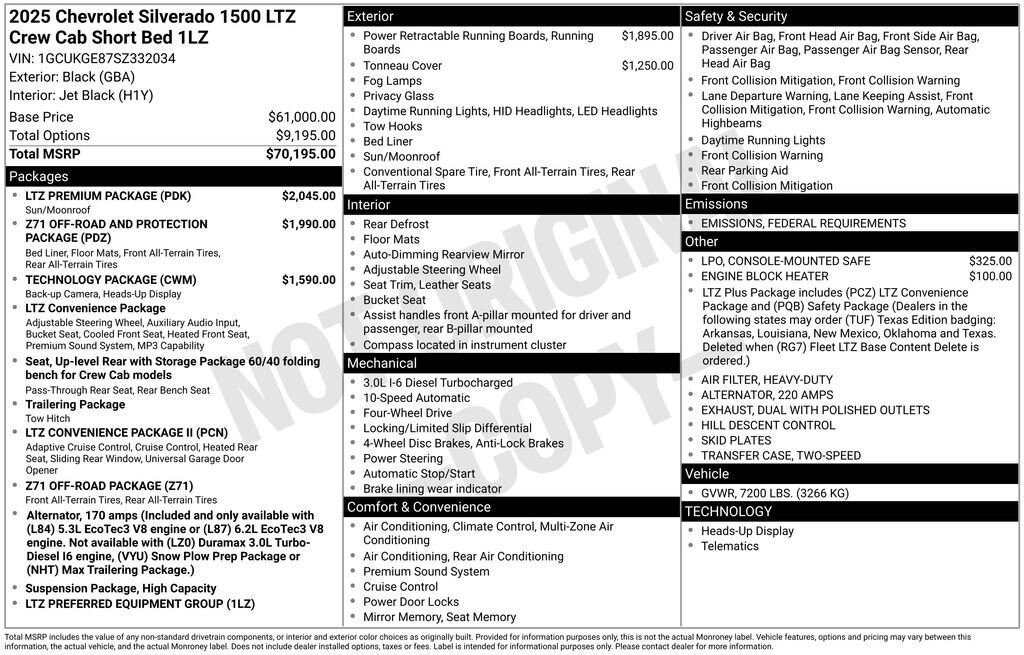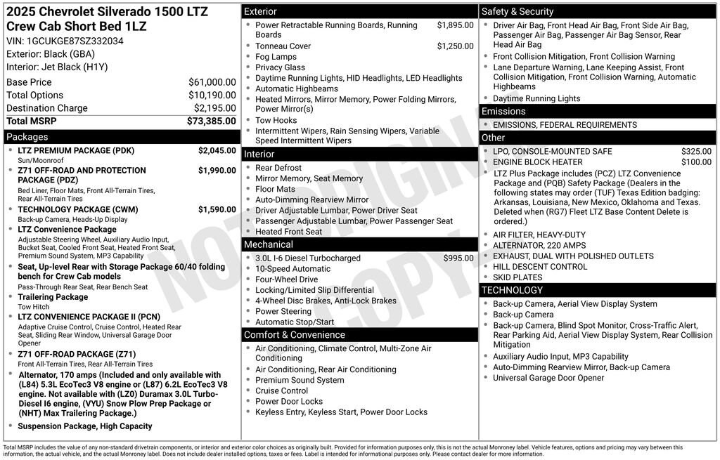TECHNOLOGY PACKAGE includes (DRZ) Rear Camera Mirror and (UV6) 15" Diagonal Head-Up Display (Includes (UVN) Bed View Camera., LTZ PREMIUM PACKAGE includes (PCN) LTZ Convenience Package II and (CF5) power sunroof, LTZ CONVENIENCE PACKAGE II includes (A48) rear sliding power window, (UG1) Universal Home Remote, (KA6) Rear Heated Outboard Seats, and (KSG) Adaptive Cruise Control-Camera , TRANSMISSION, 10-SPEED AUTOMATIC with Electronic Transmission Range Selector (ETRS), electronically controlled with overdrive, tow/haul mode and steering column paddle shifters. Includes Cruise Grade Braking and Powertrain Grade Braking, TRANSFER CASE, TWO-SPEED electronic Autotrac with push button control, TIRES, 275/60R20SL ALL-TERRAIN, BLACKWALL (Includes (QAQ) spare tire.), TIRE, SPARE 255/80R17SL ALL-SEASON, BLACKWALL, SUNROOF, POWER on Crew Cab models, SKID PLATES, SEATS, HEATED SECOND ROW OUTBOARD SEATS.