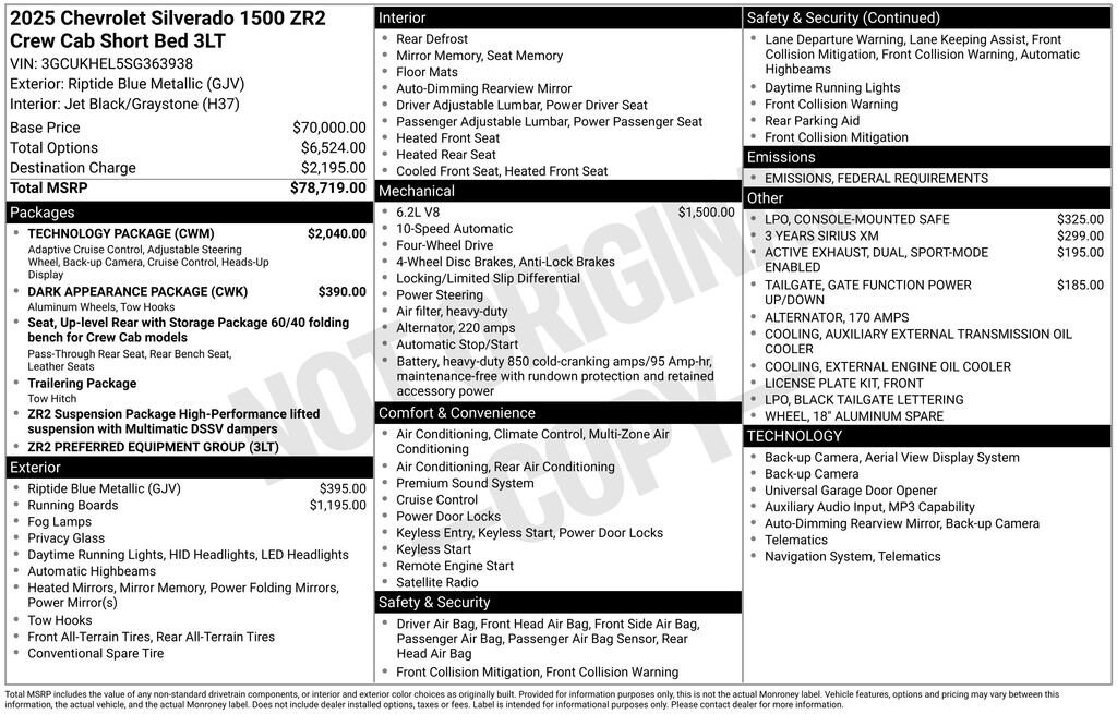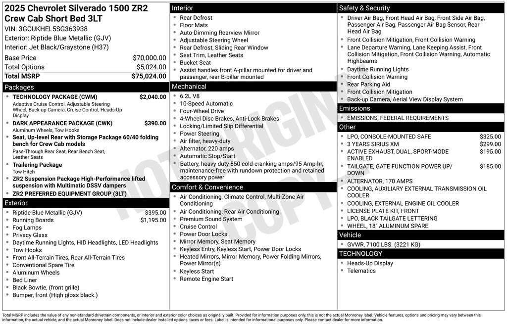 TECHNOLOGY PACKAGE includes (DRZ) Rear Camera Mirror and (UV6) 15" Diagonal Head-Up Display (Includes (KSG) Adaptive Cruise Control and (N38) Power Tilt/Telescoping steering column.), DARK APPEARANCE PACKAGE includes Black badging/decals and exhaust tips. Includes (V76) Black Tow Hooks, and (RQL) 18" Gloss Black Wheels. Exhaust ends high under rear bumper with no exposed exhaust tips.) , TRANSMISSION, 10-SPEED AUTOMATIC with Electronic Transmission Range Selector, (ETRS), electronically controlled with overdrive, tow/haul mode and steering column paddle shifters. Includes Cruise Grade Braking and Powertrain Grade Braking, TAILGATE, GATE FUNCTION POWER UP/DOWN with power lock and release, STEERING COLUMN, POWER TILT AND TELESCOPING, SEATS, FRONT BUCKET with center console (STD) (Includes (EPH) Electronic Transmission Range Selector (console mounted).), RIPTIDE BLUE METALLIC, RECOVERY HOOKS, FRONT, FRAME-MOUNTED, BLACK, REAR CAMERA MIRROR, INSIDE REARVIEW AUTO-DIMMING with full camera display, REAR AXLE, 3.23 RATIO.