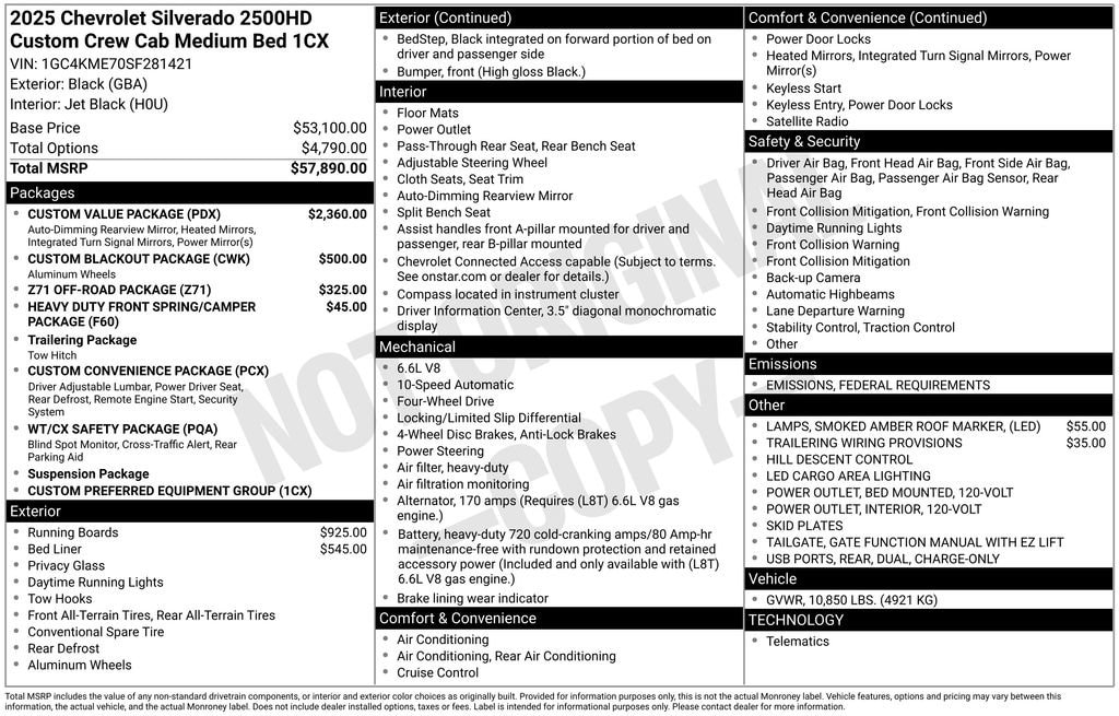 HEAVY DUTY FRONT SPRING/CAMPER PACKAGE, CUSTOM VALUE PACKAGE includes (PCX) Custom Convenience Package, (PQA) WT/CX Safety Package, (DWI) outside power-adjustable vertical trailering mirrors with heated and auto-dimming upper glass, lower convex spotter mirrors, turn signal indicators, puddle lamps, perimeter lighting and (DD8) auto-dimming rearview mirror, CUSTOM CONVENIENCE PACKAGE includes (BTV) Remote Start with (UTJ) content theft alarm, (KI4) 120-volt power outlet, (KC9) 120-volt bed-mounted power outlet, (UBI) 2 charge-only USB ports for second row, (C49) rear-window defogger, (A2X) 10-way power driver seat including power lumbar, (UF2) bed LED cargo area lighting, (QT5) EZ Lift power lock and release tailgate (Included with (PDX) Custom Value Package. Beginning with the start of production certain vehicles will be forced to include (RFO) Not Equipped with USB ports rear.), CUSTOM BLACKOUT PACKAGE includes (SRI) 20" High gloss Black painted wheels, Black badging, Black steering wheel emblem, Black tailgate lettering with (QK1) tailgate or Black bowtie with available (QK2) Multi-flex tailgate , TRAILERING WIRING PROVISIONS for trailering, 5th wheel and gooseneck trailer, includes additional 7-way wiring harness located at the rear of the pickup bed attached to the rear frame cross member, THEFT-DETERRENT SYSTEM, UNAUTHORIZED ENTRY, TAILGATE, GATE FUNCTION MANUAL WITH EZ LIFT includes power lock and release, SKID PLATES protect the oil pan, front axle and transfer case, SEATS, FRONT 40/20/40 SPLIT-BENCH with covered armrest storage and under-seat storage (lockable) (STD), SEAT ADJUSTER, DRIVER 10-WAY POWER including lumbar.
