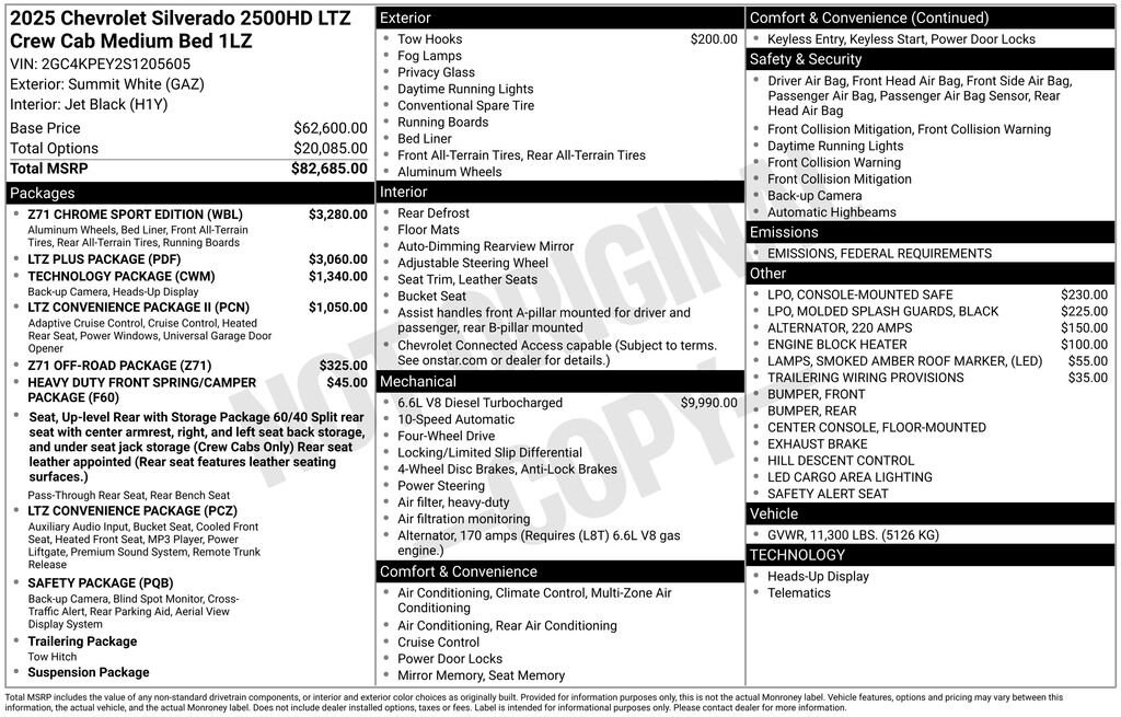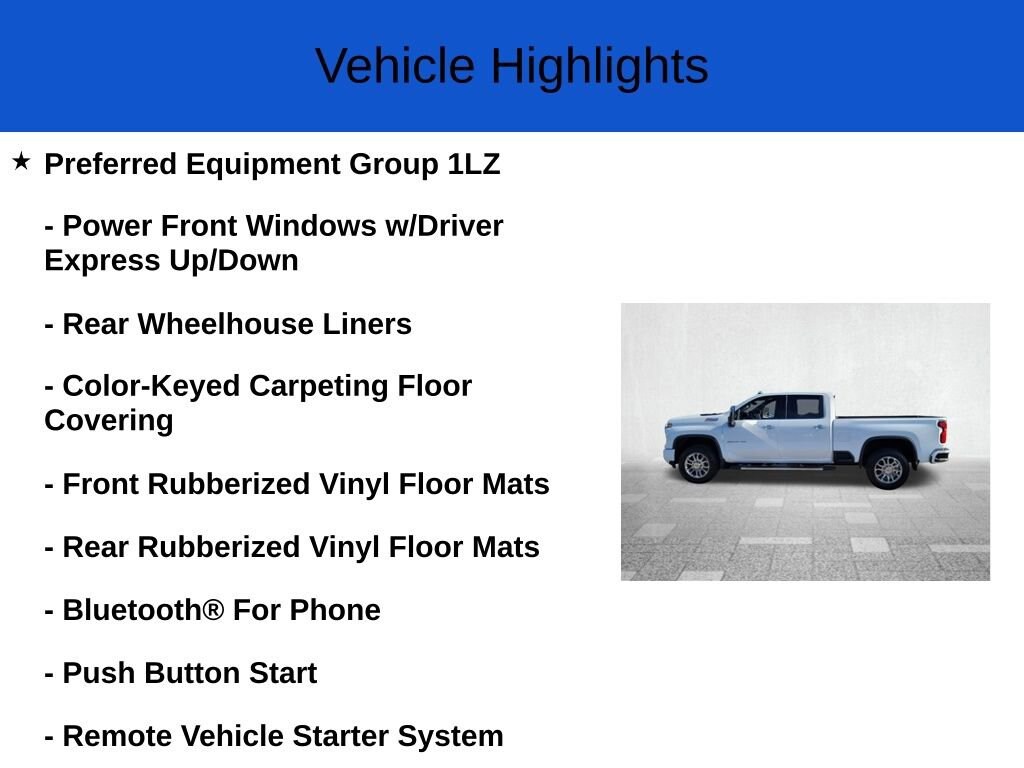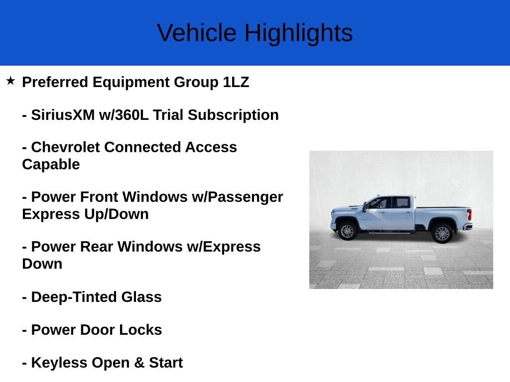 TECHNOLOGY PACKAGE includes (DRZ) Rear Camera Mirror and (UV6) Multicolor 15" Diagonal Head-Up Display, SAFETY PACKAGE includes (UD5) Front and Rear Park Assist, (UKV) Trailer Side Blind Zone Alert, (UFG) Rear Cross Traffic Alert, (UV2) HD Surround Vision, (UVN) Bed View Camera and (TRG) Trailer Camera Provisions Includes (HS1) Safety Alert Seat.), LTZ PLUS PACKAGE includes (PCZ) LTZ Convenience Package and (PQB) Safety Package, LTZ CONVENIENCE PACKAGE II includes (A48) Rear sliding power window, (UG1) Universal Home Remote, (KA6) Rear heated seats and (KSG) Adaptive Cruise Control., LTZ CONVENIENCE PACKAGE includes (A50) bucket seats with (D07) center console, (KQV) heated and ventilated front seats, (QT6) power up/down tailgate, (UF2) bed LED cargo area lighting, (UBC) USB Ports, (UQA) Bose Premium Audio System and (K4C) Wireless Charging, HEAVY DUTY FRONT SPRING/CAMPER PACKAGE , WINDOW, POWER, REAR SLIDING with rear defogger, WHEELS, 20" (50.8 CM) POLISHED 12-spoke, USB PORTS, 2, CHARGE/DATA PORTS LOCATED INSIDE CENTER CONSOLE, UNIVERSAL HOME REMOTE.