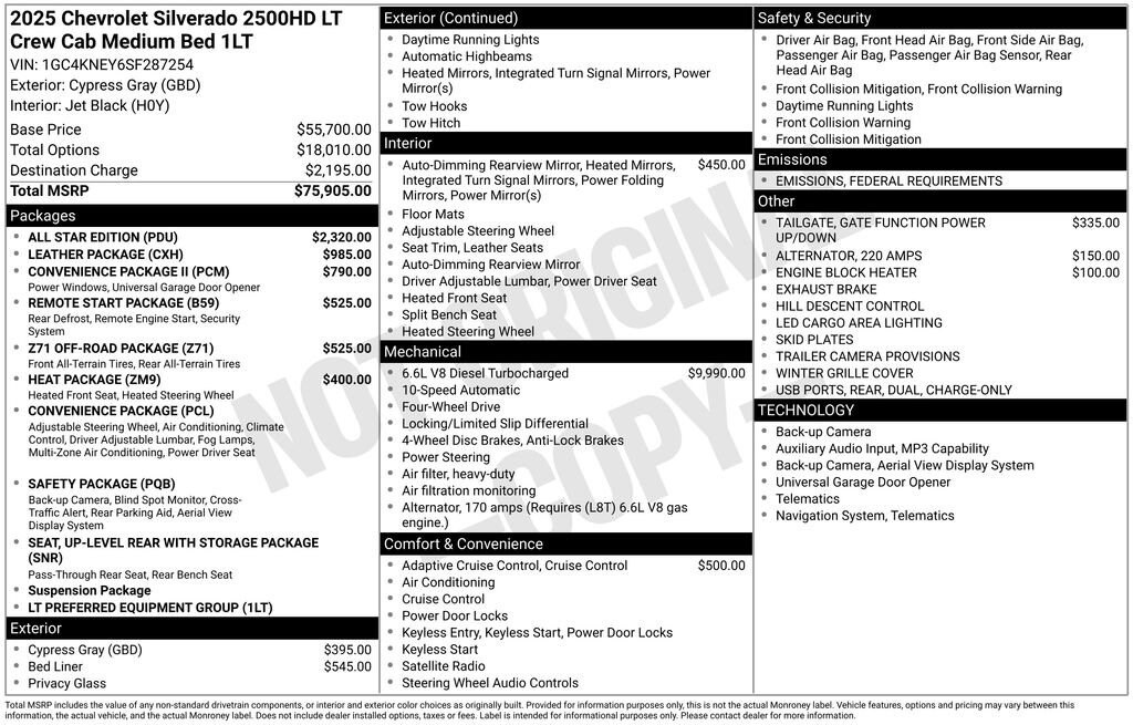 STEERING COLUMN, MANUAL TILT AND TELESCOPING (Included and only available with (PCL) Convenience Package.), SEAT, UP-LEVEL REAR WITH STORAGE PACKAGE 60/40 Split rear seat with center armrest, right, and left seat back storage, and under seat jack storage (Crew Cabs Only) Rear seat leather appointed, SAFETY PACKAGE includes (UD5) Front and Rear Park Assist, (UKV) Trailer Side Blind Zone Alert, (UFG) Rear Cross Traffic Alert, (UV2) HD Surround Vision, (UVN) Bed View Camera and (TRG) Trailer Camera Provisions, REMOTE START PACKAGE includes (BTV) Remote Start, (UTJ) Theft Deterrent System and (C49) rear-window defogger, LEATHER PACKAGE Includes (SNR) Up-level Rear Seat with Storage Package.), HEAT PACKAGE includes (KA1) Heated driver and passenger seats and (KI3) Heated steering wheel, CONVENIENCE PACKAGE II includes (PZ8) Hitch Guidance with Hitch View, (UET) Trailering App, (A48) rear sliding power window and (UG1) Universal Home Remote. Includes (R7O) Cloth Rear Seat with Storage Package., CONVENIENCE PACKAGE includes (UF2) Cargo bed LED lighting, (CJ2) dual-zone automatic climate control, (A2X) 10-way power driver seat including power lumbar, (N37) manual tilt/telescoping steering column, (T3U) LED fog lamps, ALL STAR EDITION for Crew Cab and Double Cab models, includes (PCL) Convenience Package and (PQB) Safety Package , USB PORTS, REAR, DUAL, CHARGE-ONLY.