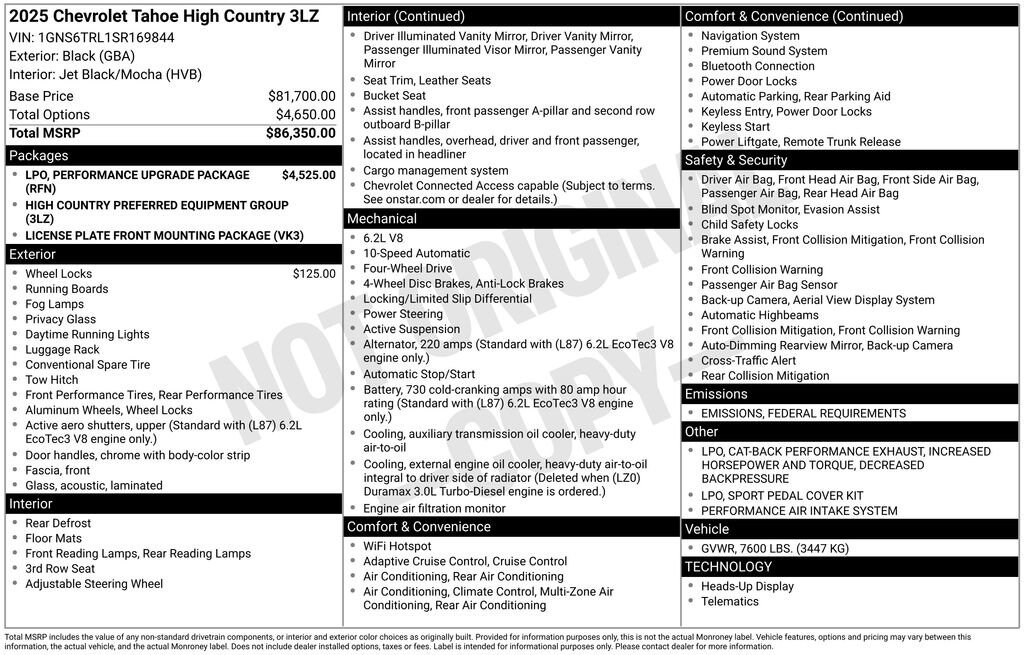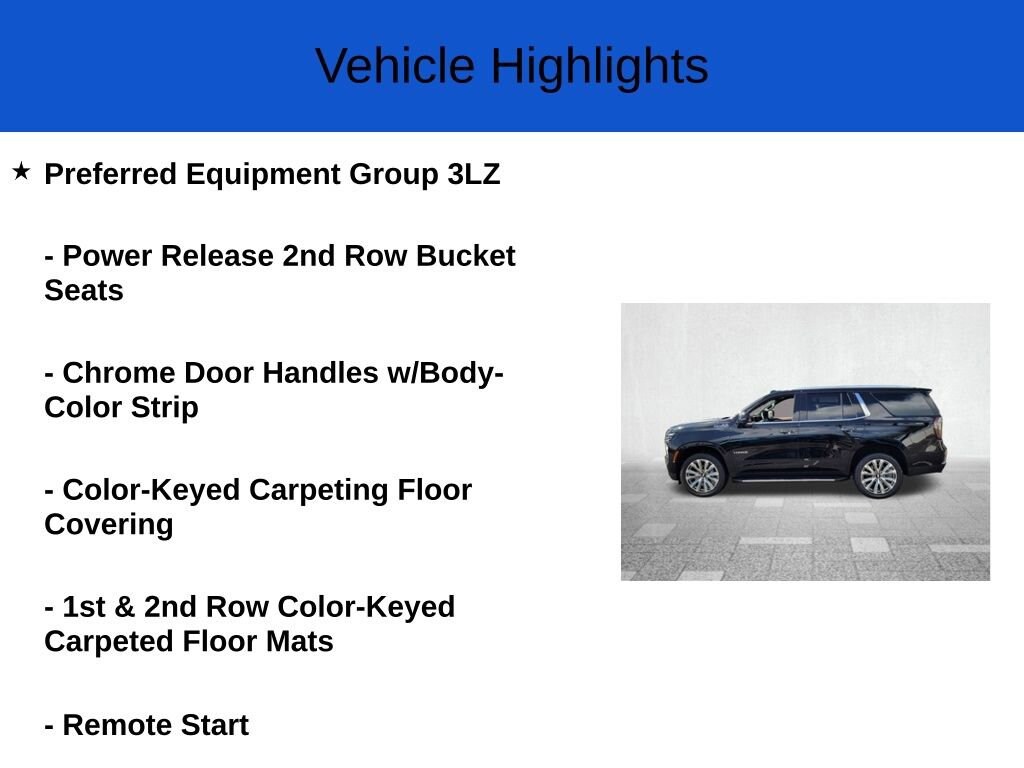 This Chevrolet Tahoe delivers a Gas V8 6.2L/ engine powering this Automatic transmission. WHEELS, 22" X 9" (55.9 CM X 22.9 CM) BRIGHT MACHINED ALUMINUM AND PAINTED AFTER MIDNIGHT (Includes (SFE) wheel locks, LPO.) (STD), TRANSMISSION, 10-SPEED AUTOMATIC electronically controlled with overdrive, includes Traction Select System including tow/haul (STD), TIRES, 275/50R22SL ALL-SEASON, BLACKWALL (STD).