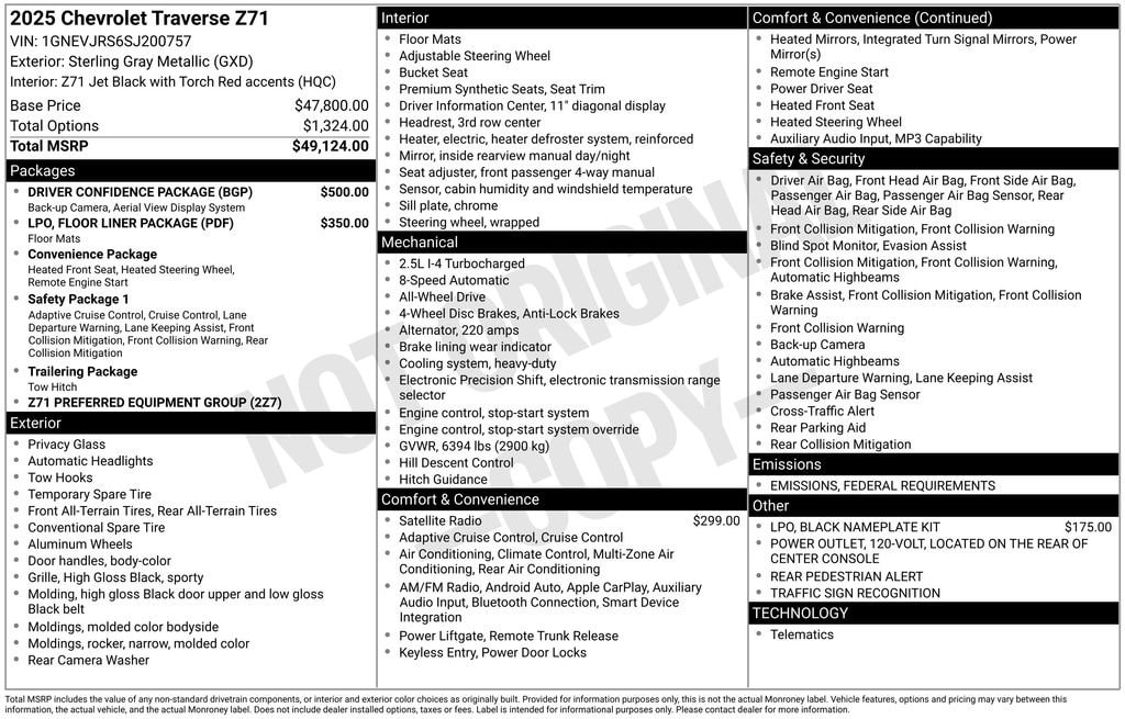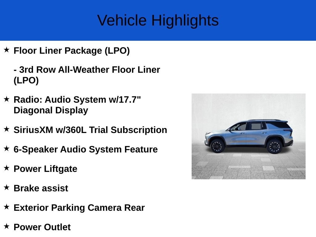 LPO, FLOOR LINER PACKAGE includes (RIA) first and second row all-weather floor liners, LPO and (RIB) third row all-weather floor liner, LPO, DRIVER CONFIDENCE PACKAGE includes (KI6) 120V-volt power outlet, (UKK) Rear Pedestrian Alert, (UV2) HD Surround Vision and (UVX) Traffic Sign Recognition , TRANSMISSION, 8-SPEED AUTOMATIC (STD), TRAFFIC SIGN RECOGNITION, STERLING GRAY METALLIC, SEATS, FRONT BUCKET (STD), REAR PEDESTRIAN ALERT, POWER OUTLET, 120-VOLT, LOCATED ON THE REAR OF CENTER CONSOLE, LPO, BLACK NAMEPLATE KIT includes Z71 in Black and RS in Black, LPO, ALL-WEATHER FLOOR LINERS, FIRST AND SECOND ROW.