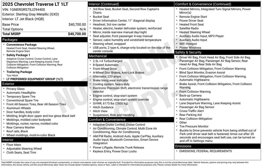 STERLING GRAY METALLIC, SEATS, FRONT BUCKET (STD), SEATING, 7-PASSENGER (2-2-3 SEATING CONFIGURATION) (STD), LT PREFERRED EQUIPMENT GROUP includes Standard Equipment, LT JET BLACK, PREMIUM CLOTH SEAT TRIM, ENGINE, 2.5L TURBO DOHC SIDI WITH VARIABLE VALVE TIMING (VVT) (328 hp [244 kW] @ 5500 rpm, 326 lb-ft of torque [442 N-m] @ 3500 rpm) (STD), Wireless Phone Charging, Windows, remote express-up/-down driver and express-down all passengers, Wi-Fi Hotspot capable (Terms and limitations apply. See onstar.com or dealer for details.), Wheels, 18" (45.7 cm) Grazen Metallic machined-face aluminum.