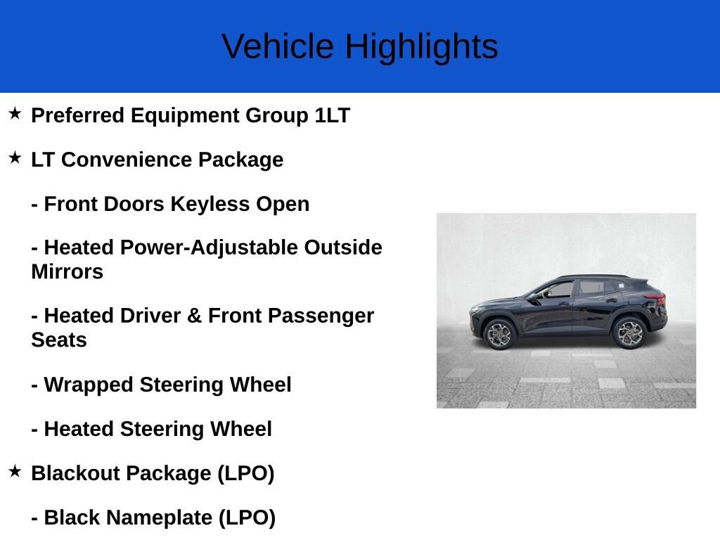 LT CONVENIENCE PACKAGE includes (AVJ) Keyless Open, (KA1) heated driver and front passenger seats, (UVD) heated steering wheel), (N5F) wrapped steering wheel and (DLF) outside heated power-adjustable mirrors, LPO, BLACKOUT PACKAGE includes (SFZ) front and rear Black bowtie emblems, LPO and (RIN) Black nameplate, LPO, DRIVER CONFIDENCE PACKAGE includes (UD7) Rear Park Assist, (UFG) Rear Cross Traffic Alert and (UKC) Lane Change Alert with Side Blind Zone Alert (Also includes (KSG) Adaptive Cruise Control. , STEERING WHEEL, HEATED, SEATS, HEATED DRIVER AND FRONT PASSENGER, SEATS, FRONT BUCKET (STD), REAR PARK ASSIST, REAR CROSS TRAFFIC ALERT, MOSAIC BLACK METALLIC, MIRRORS, OUTSIDE HEATED POWER-ADJUSTABLE, MANUAL-FOLDING.