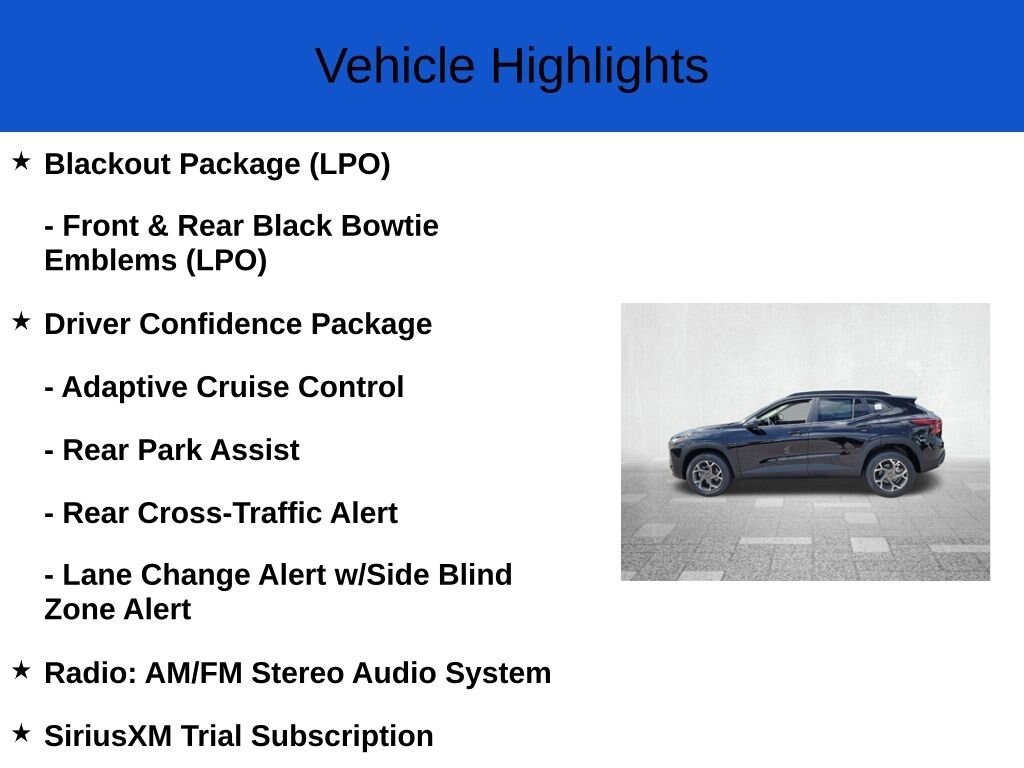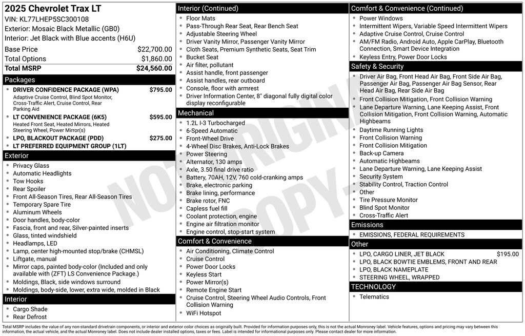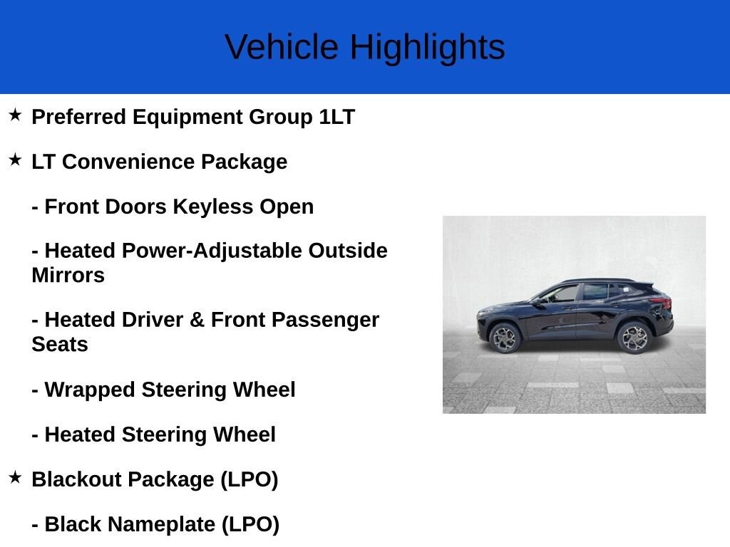 LT CONVENIENCE PACKAGE includes (AVJ) Keyless Open, (KA1) heated driver and front passenger seats, (UVD) heated steering wheel), (N5F) wrapped steering wheel and (DLF) outside heated power-adjustable mirrors, LPO, BLACKOUT PACKAGE includes (SFZ) front and rear Black bowtie emblems, LPO and (RIN) Black nameplate, LPO, DRIVER CONFIDENCE PACKAGE includes (UD7) Rear Park Assist, (UFG) Rear Cross Traffic Alert and (UKC) Lane Change Alert with Side Blind Zone Alert (Also includes (KSG) Adaptive Cruise Control. , STEERING WHEEL, HEATED, SEATS, HEATED DRIVER AND FRONT PASSENGER, SEATS, FRONT BUCKET (STD), REAR PARK ASSIST, REAR CROSS TRAFFIC ALERT, MOSAIC BLACK METALLIC, MIRRORS, OUTSIDE HEATED POWER-ADJUSTABLE, MANUAL-FOLDING.