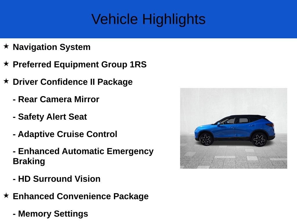 Scores 26 Highway MPG and 19 City MPG! This Chevrolet Blazer boasts a Turbocharged Gas I4 2.0L/ engine powering this Automatic transmission. ENGINE, 2.0L TURBO, 4-CYLINDER, SIDI DOHC WITH VARIABLE VALVE TIMING (VVT) with Stop/Start (228 hp (170 kW) at 5000 rpm, 258 lb-ft of torque [350 N-m]) @ 1500-4000 rpm) (STD), Wireless Charging, Wireless Apple CarPlay/Wireless Android Auto.
