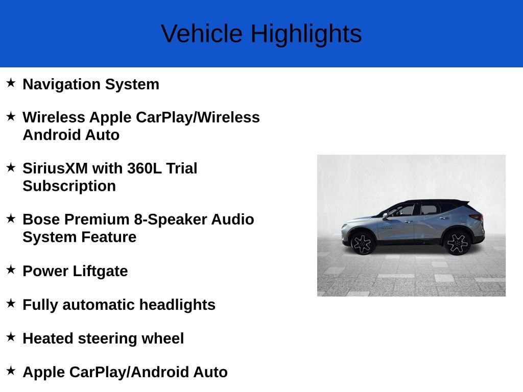 Scores 26 Highway MPG and 19 City MPG! This Chevrolet Blazer boasts a Turbocharged Gas I4 2.0L/ engine powering this Automatic transmission. ENGINE, 2.0L TURBO, 4-CYLINDER, SIDI DOHC WITH VARIABLE VALVE TIMING (VVT) with Stop/Start (228 hp (170 kW) at 5000 rpm, 258 lb-ft of torque [350 N-m]) @ 1500-4000 rpm) (STD), Wireless Charging, Wireless Apple CarPlay/Wireless Android Auto.