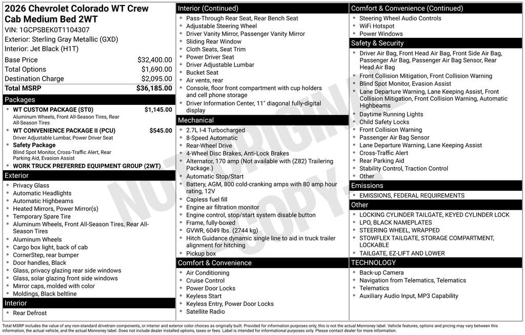 Boasts 23 Highway MPG and 19 City MPG! This Chevrolet Colorado boasts a Turbocharged Gas I4 2.7L/ engine powering this Automatic transmission. WT CUSTOM PACKAGE includes (PZX) 18" Black aluminum wheels, (QIA) 265/60R18 all-season, blackwall tires and (RIK) Black badging, LPO, WT CONVENIENCE PACKAGE II includes (N5G) 4-spoke wrapped steering wheel, (A2X) 8-way power driver seat, (AL9) driver seat power lumbar, (PPA) EZ lift and lower tailgate, (BPC) StowFlex Tailgate and (BDR) Locking Cylinder, WORK TRUCK PREFERRED EQUIPMENT GROUP includes standard equipment.