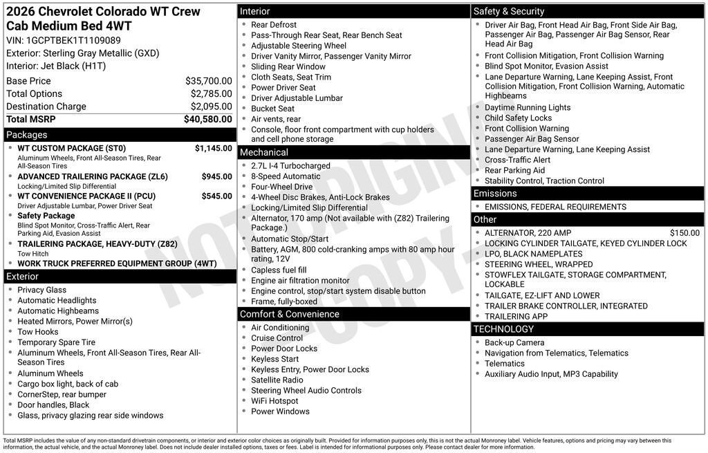 TRAILERING PACKAGE, HEAVY-DUTY includes trailer hitch and 7-pin connector (Includes (JL1) Trailer brake controller., ADVANCED TRAILERING PACKAGE (Includes (Z82) Trailering Package, (G80) Differential, automatic locking rear, (U1D) Trailering App.) , TRAILERING APP, TRAILER BRAKE CONTROLLER, INTEGRATED, TIRES, 265/60R18 ALL-SEASON, BLACKWALL (Requires (PZX) 18" Black aluminum wheels.), TAILGATE, EZ-LIFT AND LOWER, STOWFLEX TAILGATE, STORAGE COMPARTMENT, LOCKABLE, STERLING GRAY METALLIC, STEERING WHEEL, WRAPPED, SEATS, FRONT BUCKET (STD).