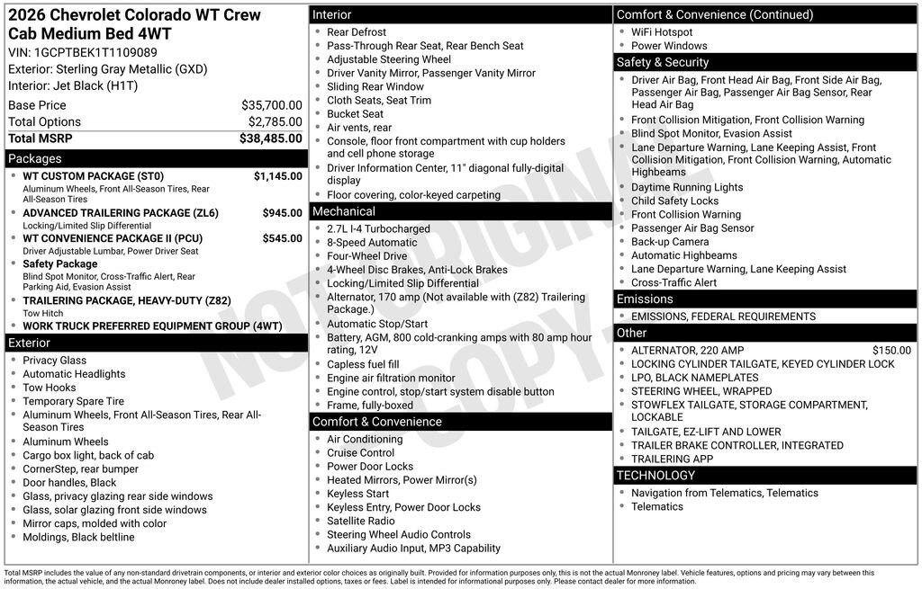 Scores 21 Highway MPG and 17 City MPG! This Chevrolet Colorado boasts a Turbocharged Gas I4 2.7L/ engine powering this Automatic transmission. WT CUSTOM PACKAGE includes (PZX) 18" Black aluminum wheels, (QIA) 265/60R18 all-season, blackwall tires and (RIK) Black badging, LPO, WT CONVENIENCE PACKAGE II includes (N5G) 4-spoke wrapped steering wheel, (A2X) 8-way power driver seat, (AL9) driver seat power lumbar, (PPA) EZ lift and lower tailgate, (BPC) StowFlex Tailgate and (BDR) Locking Cylinder, WORK TRUCK PREFERRED EQUIPMENT GROUP includes standard equipment.