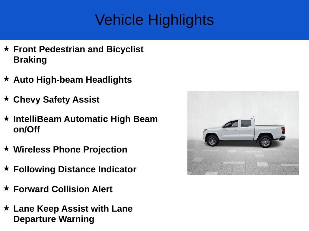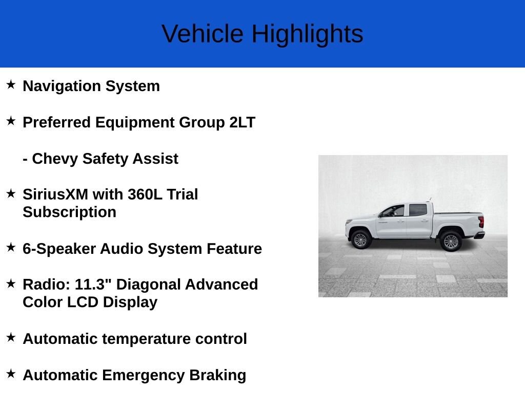 Beyond its impressive powertrain, the Colorado LT is equipped with a host of advanced technologies and premium amenities. The 11.3-inch diagonal advanced color LCD display puts a wealth of information and connectivity at your fingertips, while features like wireless phone projection, navigation, and Chevy Safety Assist provide added convenience and peace of mind.
