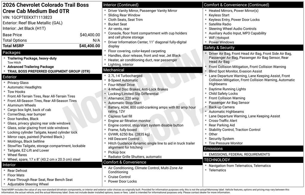TIRES, 265/65R18 ALL-TERRAIN, BLACKWALL, 32" OD (STD), TIRE, SPARE 265/70R17SL ALL-SEASON, BLACKWALL (STD), SEATS, FRONT BUCKET (STD), REEF BLUE METALLIC, REAR AXLE, 3.42 RATIO, JET BLACK, CLOTH SEAT TRIM, ENGINE, TURBOMAX (310 hp [231 kW] @ 5600 rpm, 430 lb-ft of torque [583 Nm] @ 3000 rpm) (STD), 11.3" DIAGONAL ADVANCED COLOR LCD DISPLAY WITH GOOGLE BUILT-IN includes color touch-screen, multi-touch display, AM/FM stereo, Bluetooth streaming audio for music and most phones; featuring wireless Android Auto and Apple CarPlay capability for compatible phones, advanced voice recognition, in-vehicle apps, personalized profiles for infotainment and vehicle settings (STD), Wireless phone projection, for Apple CarPlay and Android Auto, Windshield, solar absorbing.
