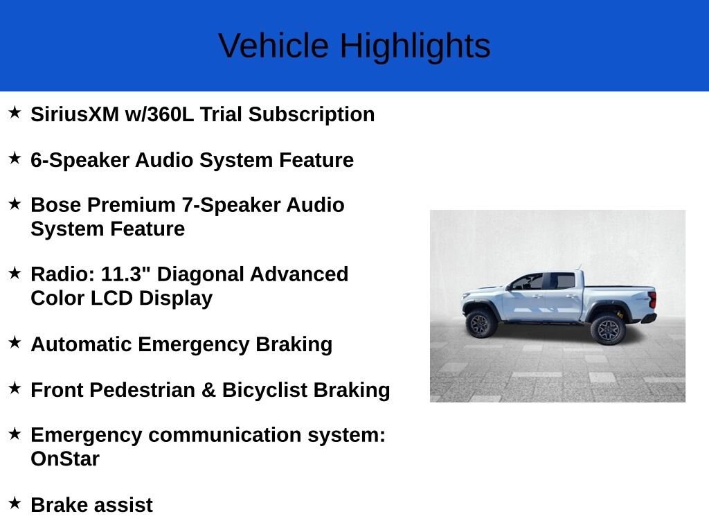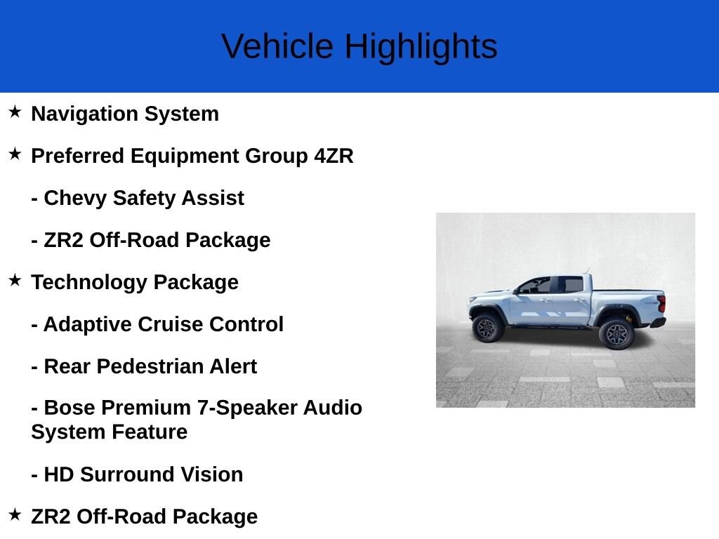 Boasts 17 Highway MPG and 17 City MPG! This Chevrolet Colorado delivers a Turbocharged Gas I4 2.7L/ engine powering this Automatic transmission. ZR2 PREFERRED EQUIPMENT GROUP includes standard equipment, WHEELS, 17" X 8.0" (43.2 CM X 20.3 CM), GRAPHITE AND OXIDE GOLD ALUMINUM (STD), UNDERBODY CAMERAS forward and rearward facing views, cameras with wash functionality.