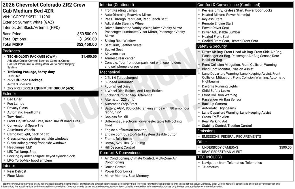 TECHNOLOGY PACKAGE includes (KSG) Adaptive Cruise Control, (UKK) Rear Pedestrian Alert and (UV2) HD Surround Vision (Includes (UQA) Bose Premium Audio System.) , TRANSMISSION, 8-SPEED AUTOMATIC (STD), TIRES, LT285/70R17, BLACKWALL, 33" OD MT (STD), TIRE, SPARE LT285/70R17, BLACKWALL (STD), SUMMIT WHITE, SHIP THRU, MULTIPLE HANDLING CHARGE, (CGN) SPRAY-ON BEDLINER, SHIP TO AUTO TRUCK GROUP, O'FALLON, MO, RETURN TO WENTZVILLE ASSEMBLY FOR FINAL SHIPMENT, SEATS, FRONT BUCKET (STD), REAR PEDESTRIAN ALERT, REAR AXLE, 3.42 RATIO, JET BLACK/ARTEMIS, PERFORATED LEATHER-APPOINTED FRONT SEAT TRIM.