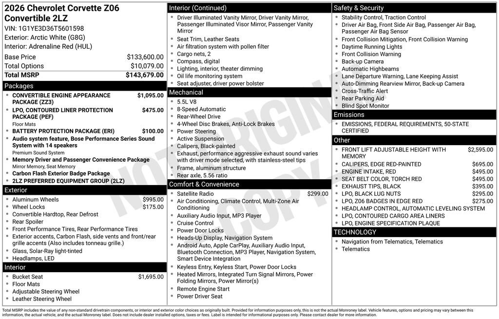 LPO, CONTOURED LINER PROTECTION PACKAGE includes (CAV) contoured trunk cargo area liners with Jake logo and (RIA) all-weather floor liners with Jake logo, Genuine Corvette Accessory, BATTERY PROTECTION PACKAGE , SEATS, GT2 BUCKET, SEAT BELT COLOR, TORCH RED, LPO, Z06 BADGES IN EDGE RED Genuine Corvette Accessory, LPO, ENGINE SPECIFICATION PLAQUE Genuine Corvette Accessory, LPO, CONTOURED CARGO AREA LINERS with Jake logo, Genuine Corvette Accessory, LPO, BLACK WHEEL LOCKS Genuine Corvette Accessory, LPO, BLACK LUG NUTS Genuine Corvette Accessory, LPO, ALL-WEATHER FLOOR LINERS with Jake logo, Genuine Corvette Accessory.
