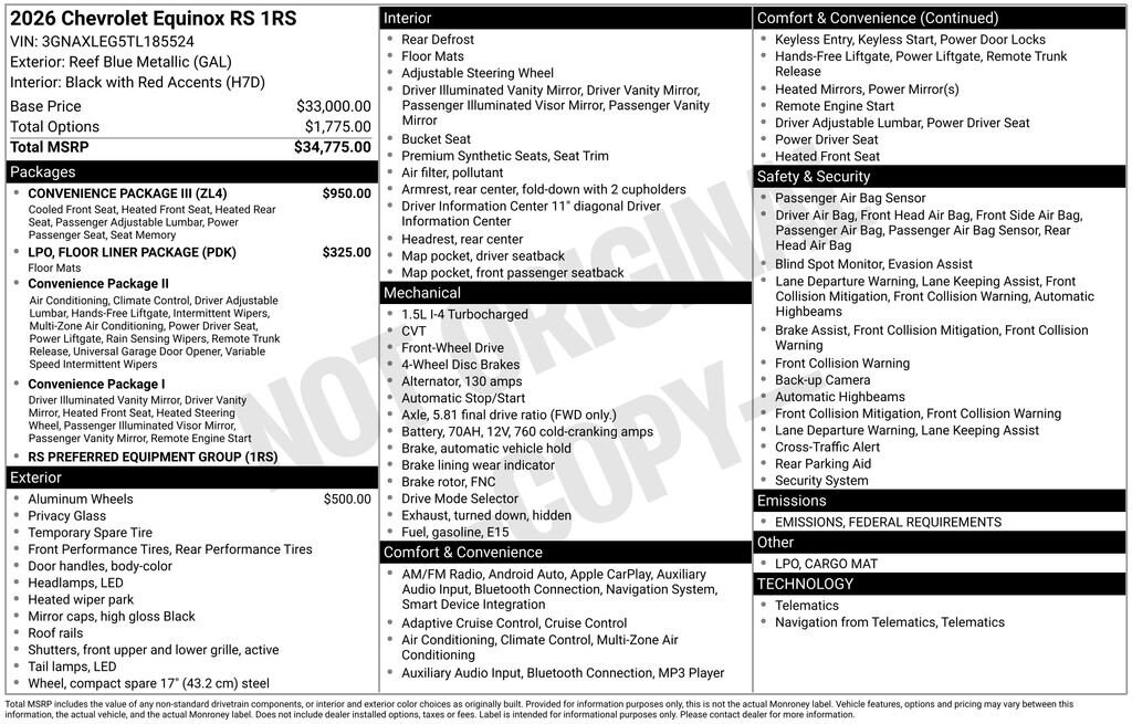 LPO, FLOOR LINER PACKAGE Includes (RIA) All-weather floor liners, LPO, (RIS) Second Row All-weather mat, LPO and (VLI) Cargo mat, LPO., CONVENIENCE PACKAGE III includes (A7K) 8-way power front passenger seat adjuster, (KU1) ventilated driver seat (KU3) ventilated front passenger seat, (KA6) heated rear outboard seats, (AT9) 2-way power front passenger lumbar seat adjuster and (A45) memory settings , SEATS, HEATED, REAR, OUTBOARD POSITIONS, SEATS, FRONT BUCKET (STD), SEAT, VENTILATED FRONT PASSENGER, SEAT, VENTILATED DRIVER, SEAT ADJUSTER, FRONT PASSENGER 8-WAY POWER, SEAT ADJUSTER, FRONT PASSENGER 2-WAY POWER LUMBAR, RS PREFERRED EQUIPMENT GROUP Includes Standard Equipment, REEF BLUE METALLIC.