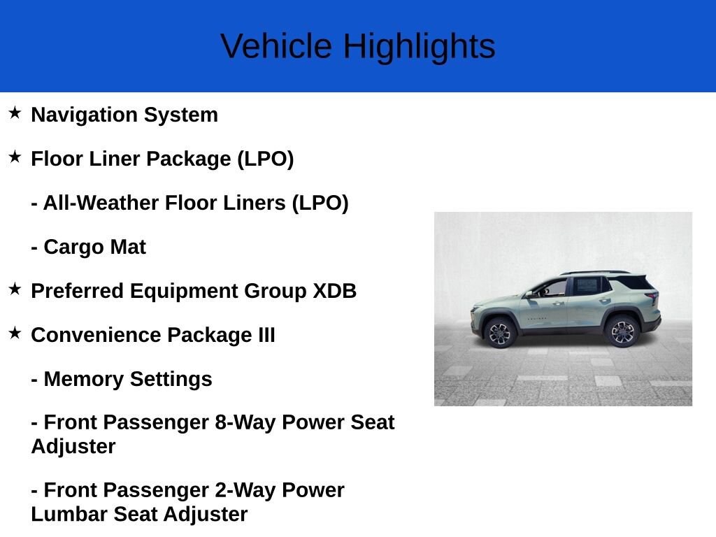 LPO, FLOOR LINER PACKAGE Includes (RIA) All-weather floor liners, LPO, (RIS) Second Row All-weather mat, LPO and (VLI) Cargo mat, LPO., CONVENIENCE PACKAGE III includes (A7K) 8-way power front passenger seat adjuster, (KU1) ventilated driver seat (KU3) ventilated front passenger seat, (KA6) heated rear outboard seats, (AT9) 2-way power front passenger lumbar seat adjuster and (A45) memory settings , SEATS, FRONT BUCKET (STD), SEAT, VENTILATED FRONT PASSENGER, SEAT, VENTILATED DRIVER, SEAT ADJUSTER, FRONT PASSENGER 8-WAY POWER, SEAT ADJUSTER, FRONT PASSENGER 2-WAY POWER LUMBAR, MEMORY SETTINGS includes presets for seat adjuster, outside rearview mirror and driver personalization, MAPLE SUGAR, SUEDED MICROFIBER SEAT TRIM, LPO, SECOND ROW ALL-WEATHER MAT.