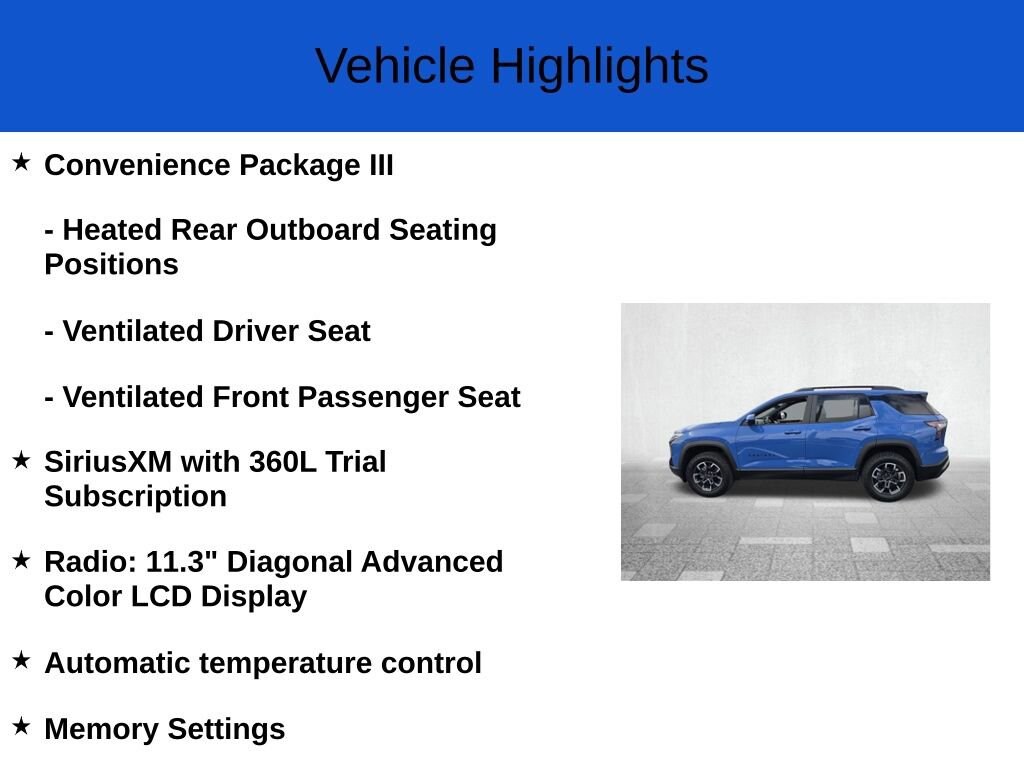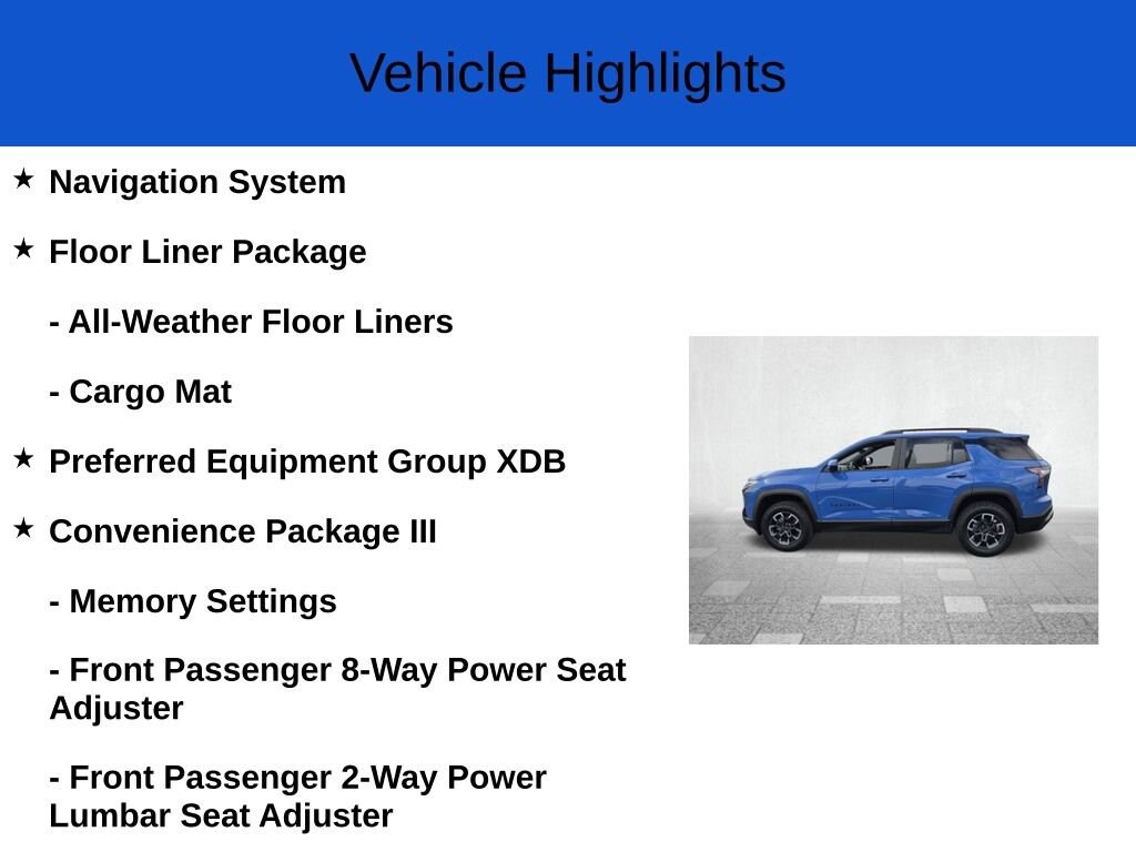 LPO, FLOOR LINER PACKAGE Includes (RIA) All-weather floor liners, LPO, (RIS) Second Row All-weather mat, LPO and (VLI) Cargo mat, LPO., CONVENIENCE PACKAGE III includes (A7K) 8-way power front passenger seat adjuster, (KU1) ventilated driver seat (KU3) ventilated front passenger seat, (KA6) heated rear outboard seats, (AT9) 2-way power front passenger lumbar seat adjuster and (A45) memory settings , SEATS, FRONT BUCKET (STD), SEAT, VENTILATED FRONT PASSENGER, SEAT, VENTILATED DRIVER, SEAT ADJUSTER, FRONT PASSENGER 8-WAY POWER, SEAT ADJUSTER, FRONT PASSENGER 2-WAY POWER LUMBAR, REEF BLUE METALLIC, MEMORY SETTINGS includes presets for seat adjuster, outside rearview mirror and driver personalization, MAPLE SUGAR, SUEDED MICROFIBER SEAT TRIM.