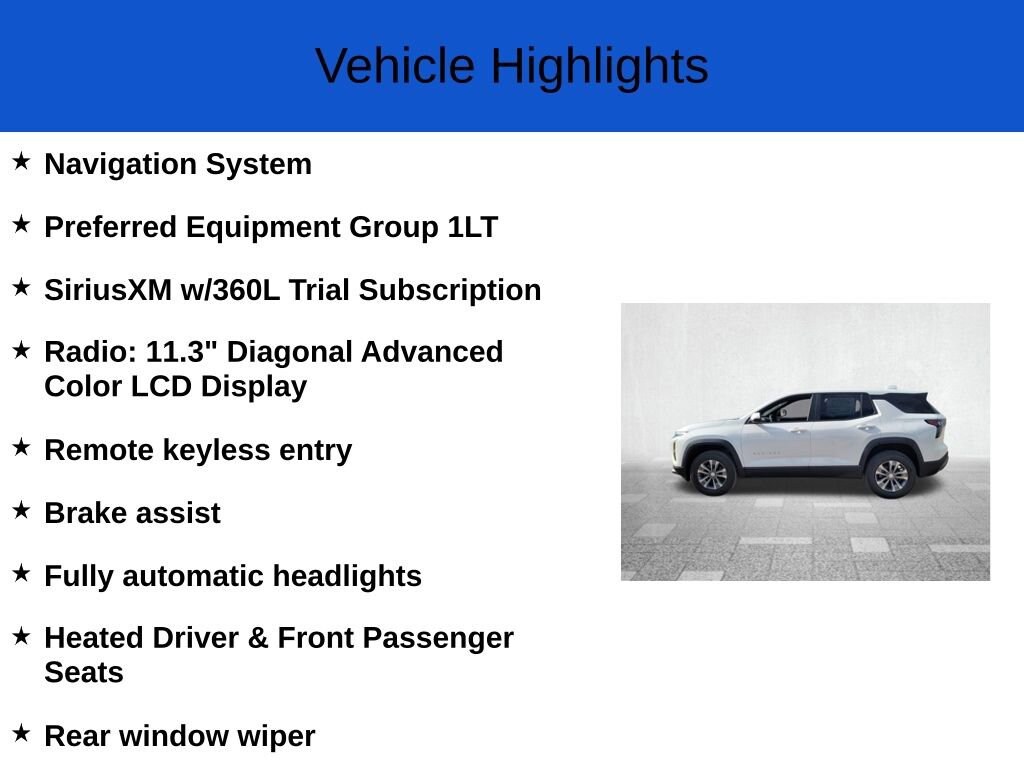 SUMMIT WHITE, SEATS, FRONT BUCKET (STD), LT PREFERRED EQUIPMENT GROUP includes Standard Equipment, ENGINE, 1.5L TURBO DOHC 4-CYLINDER, SIDI, VVT (STD), BLACK, CLOTH SEAT TRIM, AXLE, 5.81 FINAL DRIVE RATIO, Wireless Apple CarPlay/Wireless Android Auto, Windows, remote express-up/-down driver and express-down all passengers, Window, rear side, solar absorbing, privacy tinting, Wi-Fi Hotspot capable (Terms and limitations apply. See onstar.com or dealer for details.).