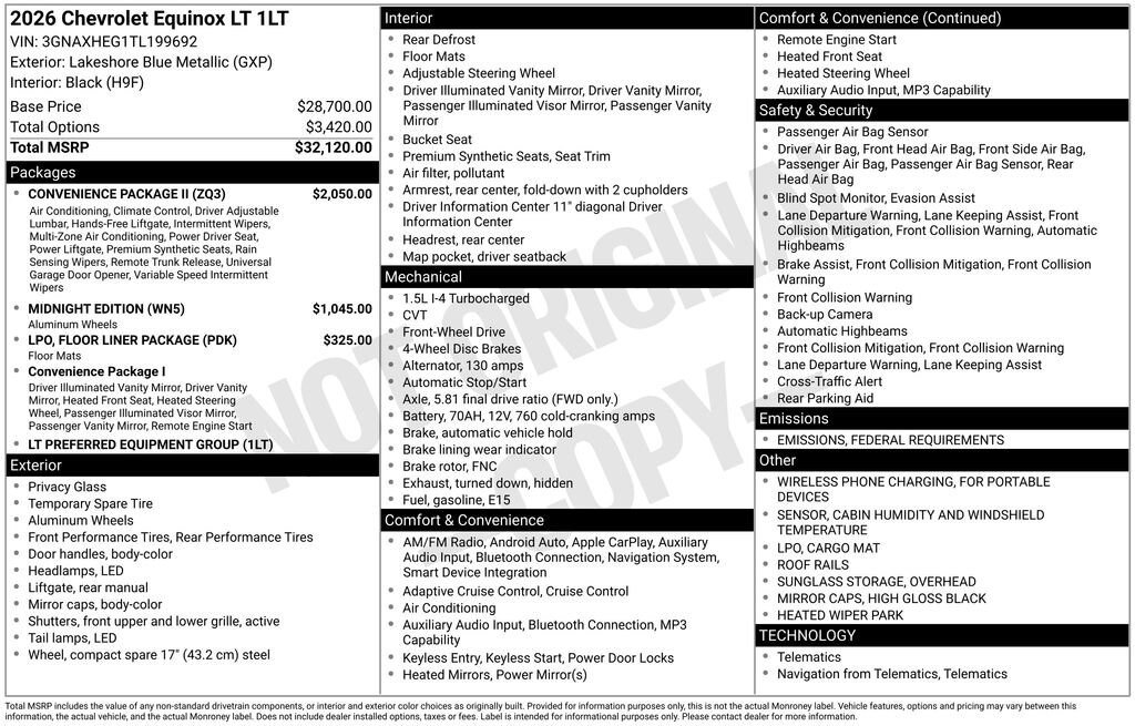 This Chevrolet Equinox delivers a Turbocharged Gas I4 1.5L/ engine powering this Variable transmission. WIRELESS PHONE CHARGING, FOR PORTABLE DEVICES, WIPERS, FRONT RAIN-SENSING, INTERMITTENT, WHEELS, 19" (48.3 CM) BLACK PAINTED ALUMINUM.