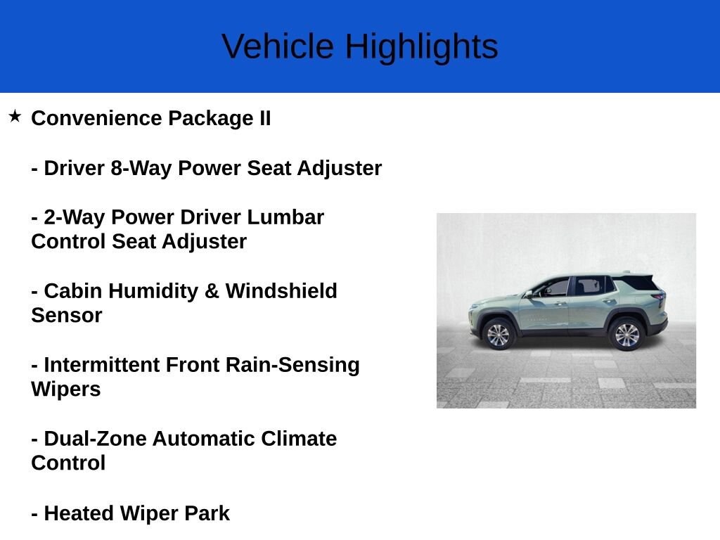 This Chevrolet Equinox delivers a Turbocharged Gas I4 1.5L/ engine powering this Variable transmission. WIRELESS PHONE CHARGING, FOR PORTABLE DEVICES, WIPERS, FRONT RAIN-SENSING, INTERMITTENT, WHEELS, 17" (43.2 CM) GRAZEN METALLIC MACHINED-FACE ALUMINUM (STD).