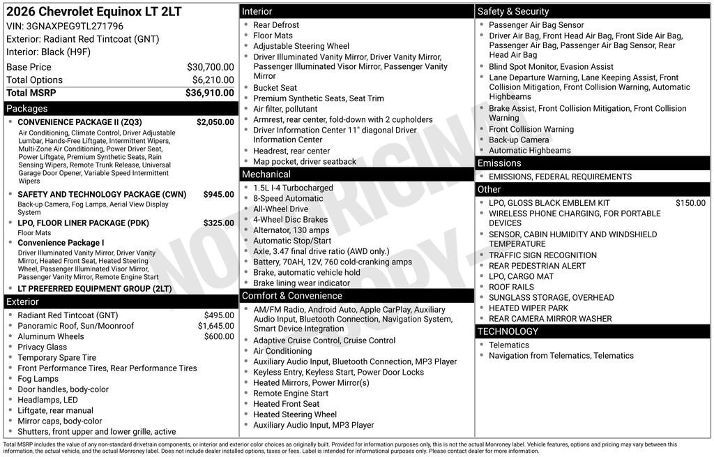 SAFETY AND TECHNOLOGY PACKAGE includes (DRZ) Rear Camera Mirror, (T3U) front fog lamps, (UKK) Rear Pedestrian Alert, (UV2) HD Surround Vision and (UVX) Traffic Sign Recognition., LPO, FLOOR LINER PACKAGE Includes (RIA) All-weather floor liners, LPO, (RIS) Second Row All-weather mat, LPO and (VLI) Cargo mat, LPO., CONVENIENCE PACKAGE II includes (A2X) 8-way power driver seat adjuster, (AL9) 2-way power driver lumbar control, (ASV) cabin humidity and windshield sensor, (K7A) Wireless Phone Charging for portable devices, (CE1) Rainsense intermittent front wipers, (CJ2) dual-zone automatic climate control, (CMO) Heated Wiper Park, (TCP) AutoSense, hands-free power programmable liftgate, (UG1) Universal Home Remote and (VK8) sunglass holder (Also includes Evotex seating in (H9F) Black or (ENY) Artemis Gray.) , UNIVERSAL HOME REMOTE includes garage door opener, programmable, TRANSMISSION, 8-SPEED AUTOMATIC (STD), TRAFFIC SIGN RECOGNITION, TIRES, 235/55R19, ALL-SEASON BLACKWALL, SUNROOF, POWER, DUAL GLASS, PANORAMIC, SLIDING with power sunshade, SUNGLASS STORAGE, OVERHEAD, SENSOR, CABIN HUMIDITY AND WINDSHIELD TEMPERATURE.