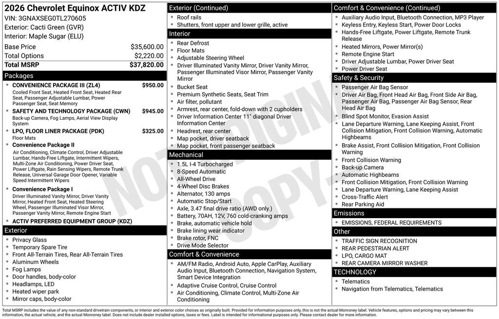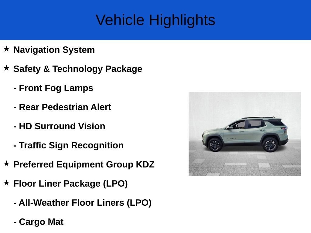 SAFETY AND TECHNOLOGY PACKAGE includes (DRZ) Rear Camera Mirror, (T3U) front fog lamps, (UKK) Rear Pedestrian Alert, (UV2) HD Surround Vision and (UVX) Traffic Sign Recognition., LPO, FLOOR LINER PACKAGE Includes (RIA) All-weather floor liners, LPO, (RIS) Second Row All-weather mat, LPO and (VLI) Cargo mat, LPO., CONVENIENCE PACKAGE III includes (A7K) 8-way power front passenger seat adjuster, (KU1) ventilated driver seat (KU3) ventilated front passenger seat, (KA6) heated rear outboard seats, (AT9) 2-way power front passenger lumbar seat adjuster and (A45) memory settings , SEATS, HEATED, REAR, OUTBOARD POSITIONS, SEATS, FRONT BUCKET (STD), SEAT, VENTILATED FRONT PASSENGER, SEAT, VENTILATED DRIVER, SEAT ADJUSTER, FRONT PASSENGER 8-WAY POWER, SEAT ADJUSTER, FRONT PASSENGER 2-WAY POWER LUMBAR, REAR PEDESTRIAN ALERT.