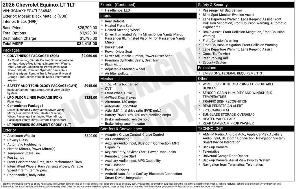 Boasts 29 Highway MPG and 26 City MPG! This Chevrolet Equinox boasts a Turbocharged Gas I4 1.5L/ engine powering this Variable transmission. WIRELESS PHONE CHARGING, FOR PORTABLE DEVICES, WIPERS, FRONT RAIN-SENSING, INTERMITTENT, WHEELS, 19" (48.3 CM) BLACK MACHINED-FACE ALUMINUM.