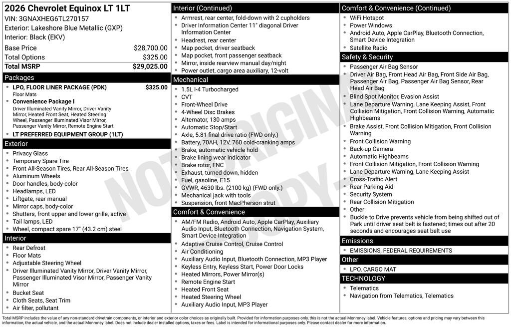 LPO, FLOOR LINER PACKAGE Includes (RIA) All-weather floor liners, LPO, (RIS) Second Row All-weather mat, LPO and (VLI) Cargo mat, LPO. , SEATS, FRONT BUCKET (STD), LT PREFERRED EQUIPMENT GROUP includes Standard Equipment, LPO, SECOND ROW ALL-WEATHER MAT, LPO, CARGO MAT, LPO, ALL-WEATHER FLOOR LINERS, LAKESHORE BLUE METALLIC, ENGINE, 1.5L TURBO DOHC 4-CYLINDER, SIDI, VVT (STD), BLACK, CLOTH SEAT TRIM, AXLE, 5.81 FINAL DRIVE RATIO.