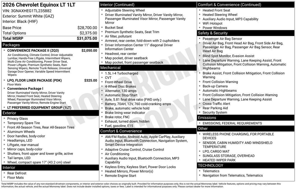 This Chevrolet Equinox delivers a Turbocharged Gas I4 1.5L/ engine powering this Variable transmission. WIRELESS PHONE CHARGING, FOR PORTABLE DEVICES, WIPERS, FRONT RAIN-SENSING, INTERMITTENT, WHEELS, 17" (43.2 CM) GRAZEN METALLIC MACHINED-FACE ALUMINUM (STD).