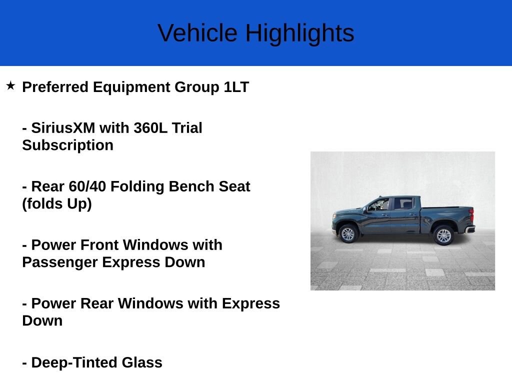 SAFETY PACKAGE includes (UV2) HD Surround Vision, (UD5) Front and Rear Park Assist, (TRG) Trailer Camera Provisions, (UKV) Trailer Side Blind Zone Alert, (UFB) Rear Cross Traffic Braking, (UKK) Rear Pedestrian Alert and (U12) Perimeter Lighting (Includes (V76) Recovery hooks., REMOTE START PACKAGE includes (BTV) Remote Start, (UTJ) Theft-deterrent system and (C49) rear-window defogger, PROTECTION PACKAGE includes (B1J) wheel house liners and (CGN) Chevytec spray-on bedliner, CONVENIENCE PACKAGE II includes (UG1) Universal Home Remote, (A48) rear sliding power window, (PZ8) Hitch Guidance with Hitch View and (UET) Trailering App , UNIVERSAL HOME REMOTE, TRANSMISSION, 8-SPEED AUTOMATIC, ELECTRONICALLY CONTROLLED with overdrive and tow/haul mode. Includes Cruise Grade Braking and Powertrain Grade Braking (STD), TRAILER SIDE BLIND ZONE ALERT, TRAILER CAMERA PROVISIONS, TIRES, 265/65R18SL ALL-SEASON, BLACKWALL, TIRE, SPARE 265/70R17SL ALL-SEASON, BLACKWALL.
