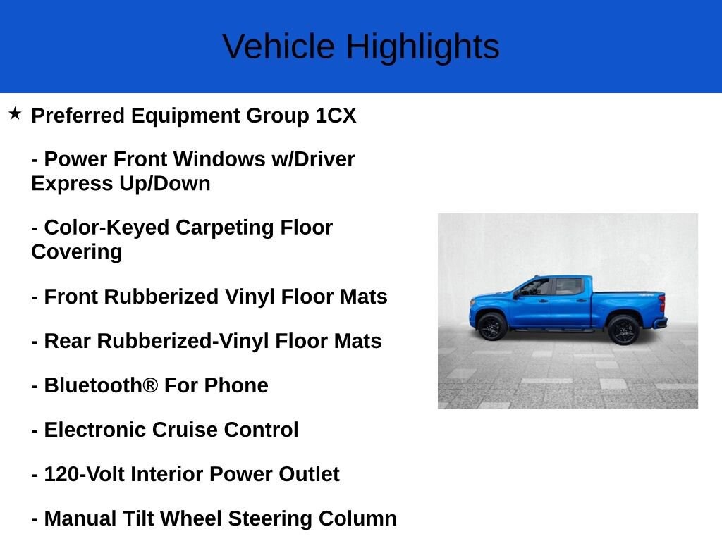 LPO, DARK ESSENTIALS PACKAGE includes (RIK) Black Silverado nameplates, along with where applicable, Black Custom/LT/RST/LTZ/High Country/Z71/6.2L/Duramax badges, LPO, (SFZ) Black bowtie, LPO and (SB7) Black tailgate CHEVROLET lettering, LPO, (dealer-installed) , TRAILER BRAKE CONTROLLER, INTEGRATED, TIRES, 275/60R20SL ALL-TERRAIN, BLACKWALL, SEATS, FRONT 40/20/40 SPLIT-BENCH with covered armrest storage and under-seat storage (lockable) (STD), RIPTIDE BLUE METALLIC, REAR AXLE, 3.42 RATIO, LPO, BLACK TAILGATE LETTERING (dealer-installed), LPO, BLACK NAMEPLATES (dealer-installed), LPO, BLACK CHROME EXHAUST TIP (dealer-installed), LPO, BLACK BOWTIE EMBLEM, FRONT (dealer-installed) When ordered with (QK2) Multi-Flex tailgate, will include Black tailgate bowtie.).
