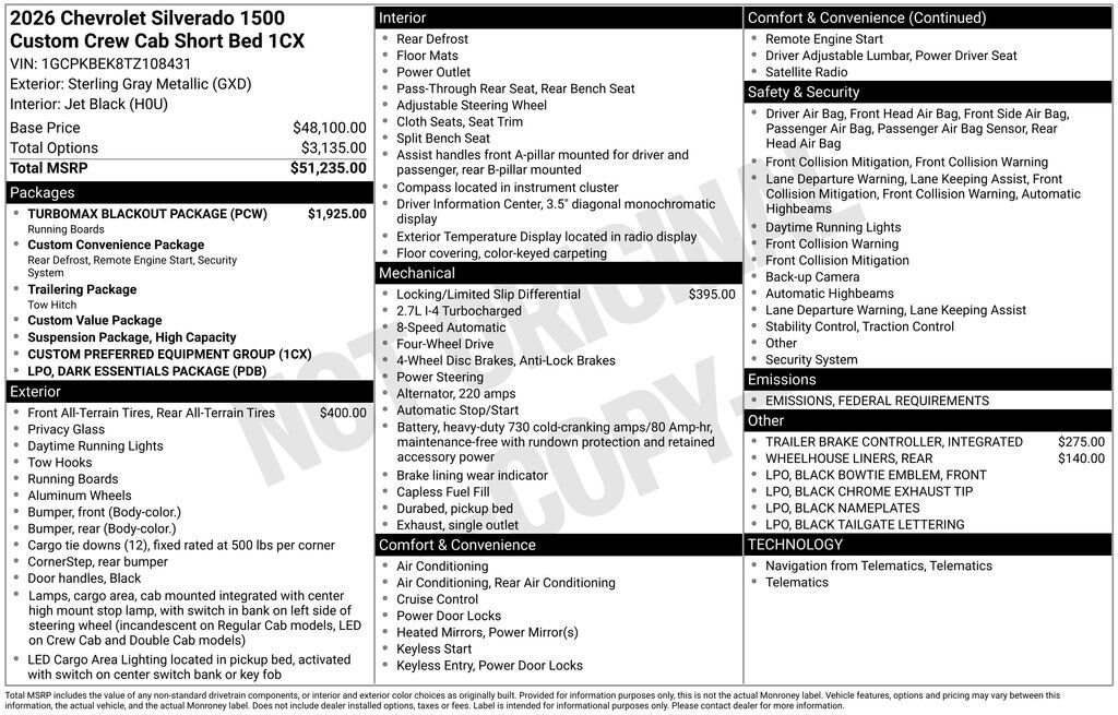 LPO, DARK ESSENTIALS PACKAGE includes (RIK) Black Silverado nameplates, along with where applicable, Black Custom/LT/RST/LTZ/High Country/Z71/6.2L/Duramax badges, LPO, (SFZ) Black bowtie, LPO and (SB7) Black tailgate CHEVROLET lettering, LPO, (dealer-installed) , TRAILER BRAKE CONTROLLER, INTEGRATED, TIRES, 275/60R20SL ALL-TERRAIN, BLACKWALL, STERLING GRAY METALLIC, SEATS, FRONT 40/20/40 SPLIT-BENCH with covered armrest storage and under-seat storage (lockable) (STD), REAR AXLE, 3.42 RATIO, LPO, BLACK TAILGATE LETTERING (dealer-installed), LPO, BLACK NAMEPLATES (dealer-installed), LPO, BLACK CHROME EXHAUST TIP (dealer-installed), LPO, BLACK BOWTIE EMBLEM, FRONT (dealer-installed) When ordered with (QK2) Multi-Flex tailgate, will include Black tailgate bowtie.).
